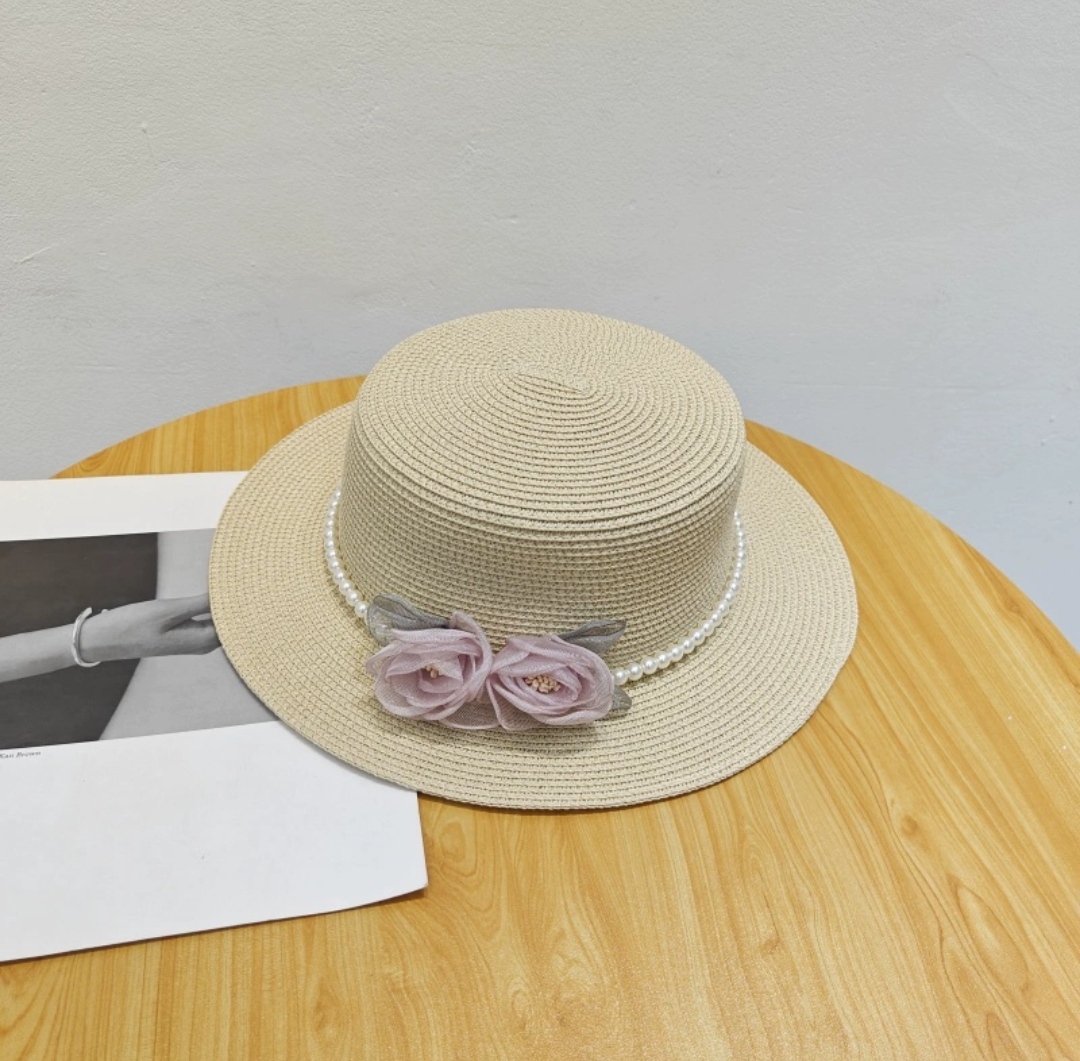✨Nón mũ rộng vành nhỏ chất liệu cói mũ rộng vành đi biển phối đai ngọc trai nhân tạo gắn 2 hoa màu hồng xinh mẫu mới thời trang Hàn Quốc dona24082508