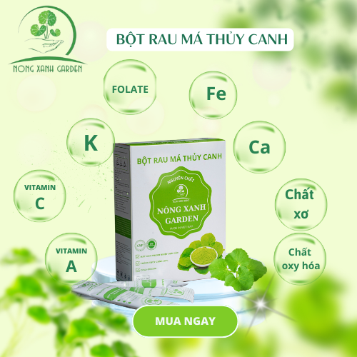 Mua tại TiktokHộp Bột Rau Má Thủy Canh Nguyên Chất Nông Xanh Garden 45GR Thực phẩm bổ sung Bột rau má với thành phần từ Rau má thủy canh tươi sau khi thu hoạch được làm sạch bằng phương pháp sục Ozone. Sau đó, kết hợp kỹ thuật sấy lạnh với công nghệ nghiền cối đá siêu mịn từ Nhật Bản nên giữ nguyên vẹn được giá trị dinh dưỡng, hương vị, màu sắc của rau má thủy canh nguyên chất.