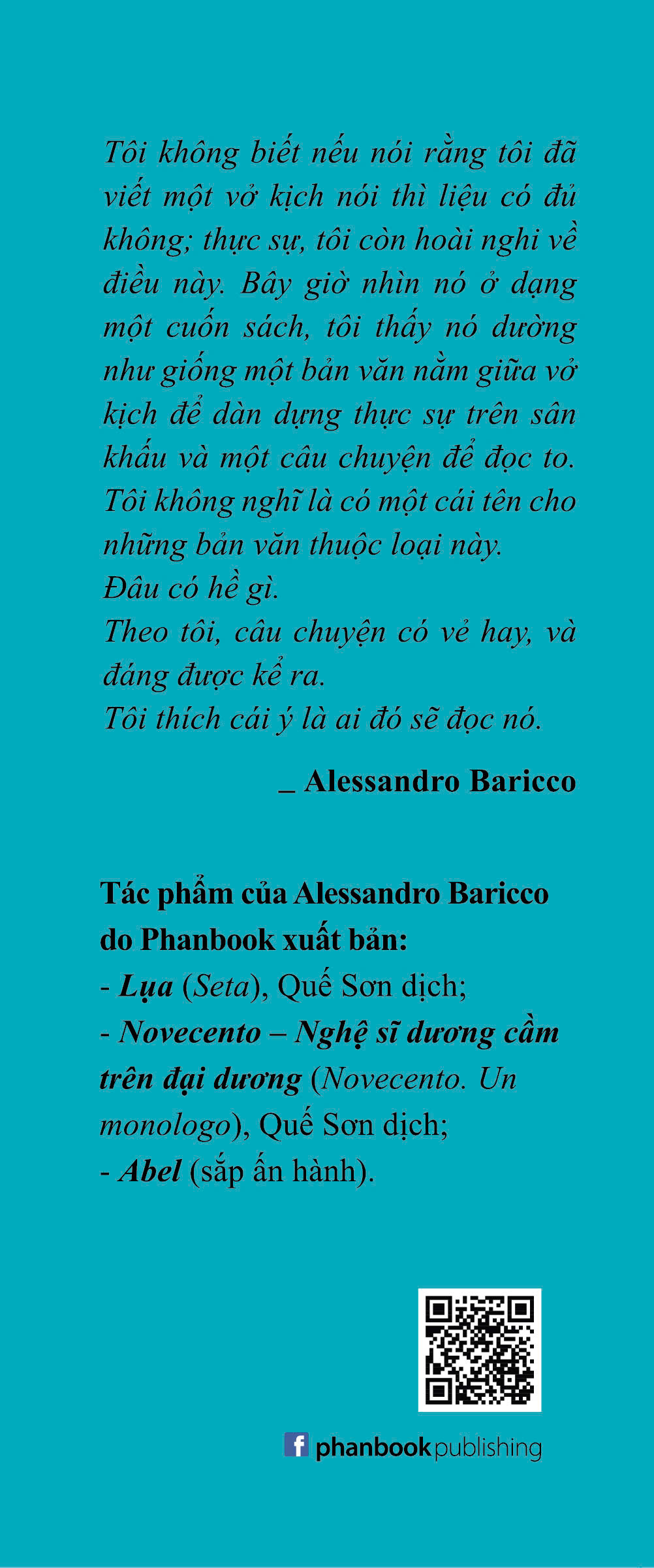 Cô đọng, giàu nhạc tính, thi tính và kịch tính, sự hài hước hòa quyện trong những suy tư triết học, Novecento – Nghệ sĩ dương cầm trên đại dương (Nguyên tác: Novecento. Un monologo) là kiệt tác mang đậm phong cách văn chương Alessandro Baricco, cũng là tác giả của Lụa.