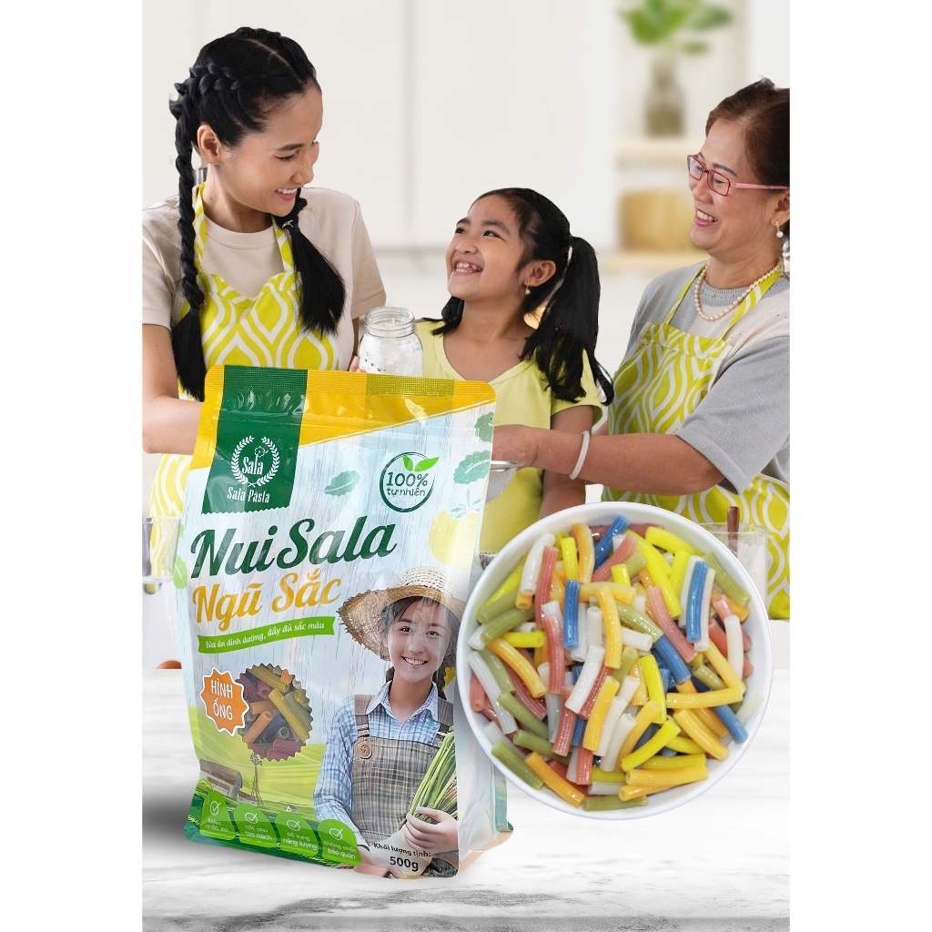 • Nui Sala ngũ sắc cho gia đình HÌNH ỐNG THẲNG phù hợp với các món xào, món canh, soup, salad, đút lò phô mai...được làm từ nguyên liệu tự nhiên chiết xuất từ 5 màu rau củ bổ sung dinh dưỡng cho cả gia đình
