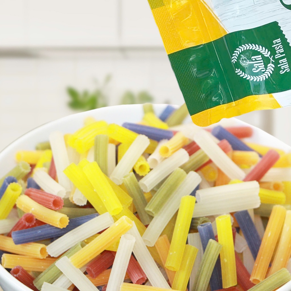 • Nui Sala ngũ sắc hình ống(thẳng) 500g: Dạng ống tròn cổ điển, 5 màu từ rau củ.