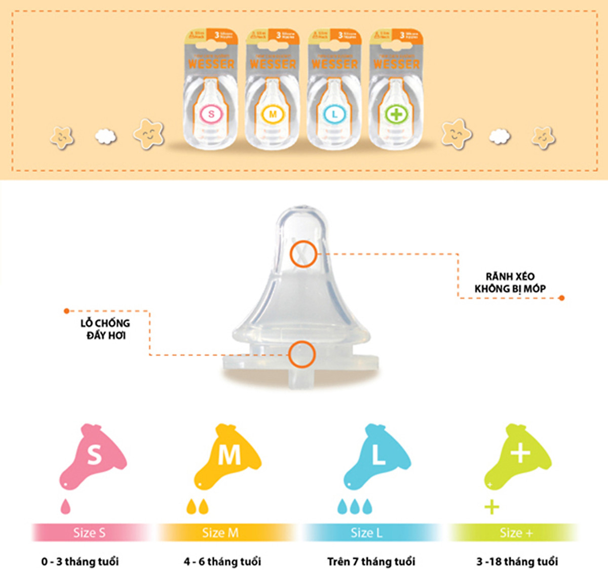 Giới thiệu Núm ty cổ hẹp Wesser ngoài chất liệu silicone siêu mềm kết hợp với hệ thống lỗ kiểm soát sữa vừa đủ với từng giai đoạn phát triển của trẻ giúp vừa chống tắc,