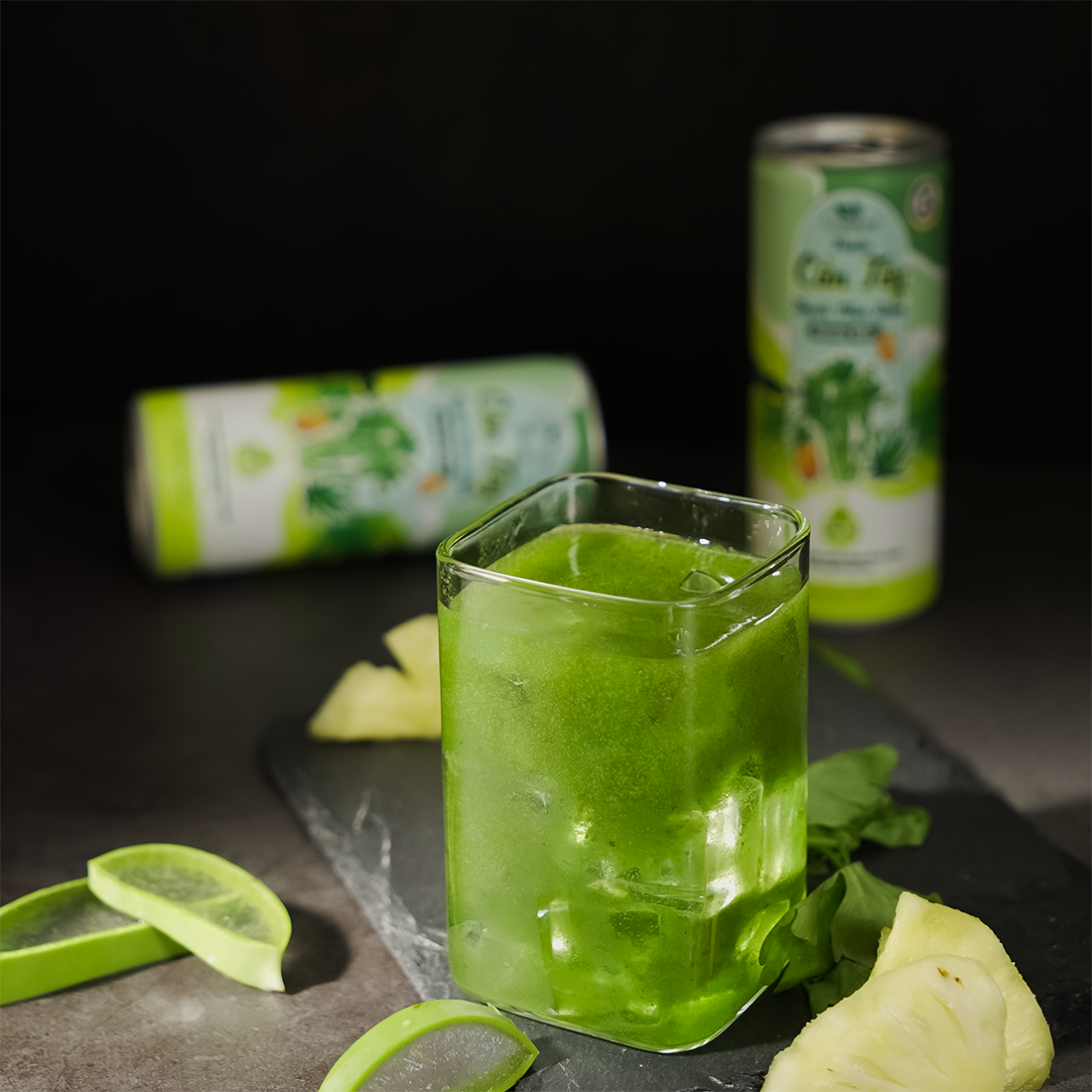 - Thành phần: Nước (50%), bột cần tây (19%), thạch nha đam (3%), đường mía, chất ổn định (INS327, INS418, INS466), chất điều chỉnh độ acid (INS330, INS331 (iii)), chất chống oxy hóa (INS316, INS386), hương dứa tổng hợp…