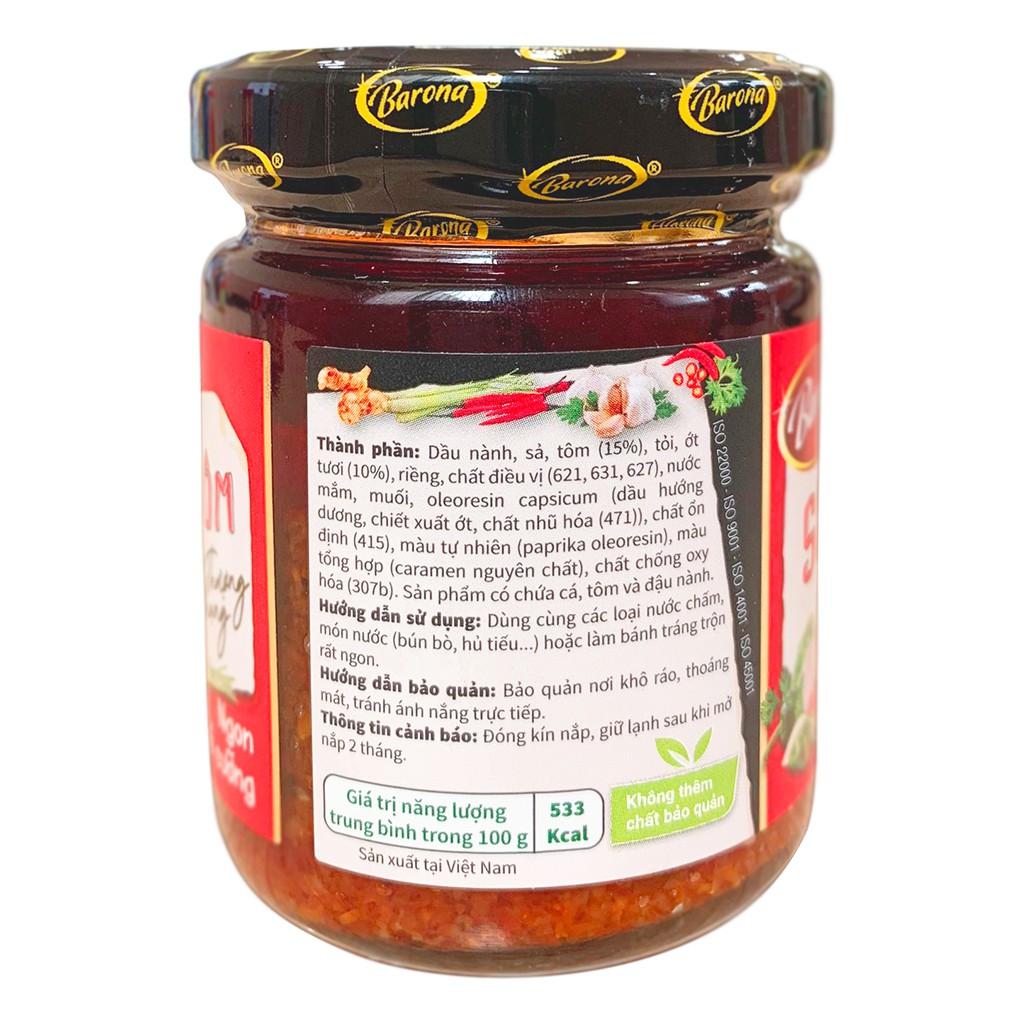 - Rau muống, rau mồng tơi, bắp chuối bào, nấm kim châm. Ăn kèm với bún/ bánh đa. Sa tế tôm XO thượng hạng Barona làm từ ớt tươi được chọn lọc kỹ lưỡng hoà quyện cùng vị tôm chấy & sả tươi phi thơm tạo nên hương vị thơm ngon khó cưỡng, thổi bùng vị giác muốn ăn mãi không ngừng. Sản phẩm không thêm chất bảo quản & được bảo quản trong hũ thuỷ tinh cao cấp, đảm bảo an toàn cho cả gia đình.