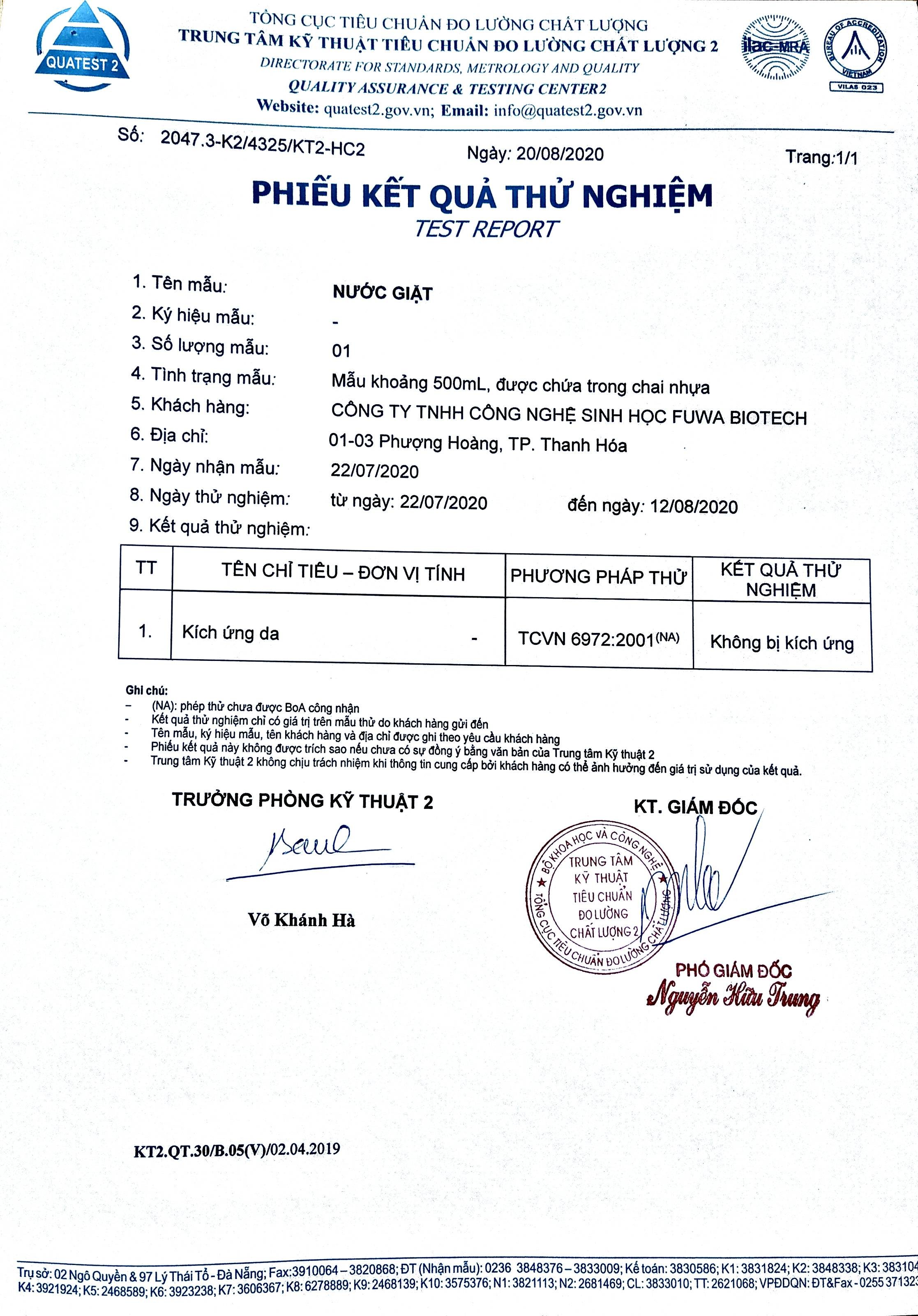 Mua tại TiktokNước giặt hữu cơ Fuwa3e ứng dụng công nghệ lên men vỏ dứa với Enzyme Bromelain có trong dứa có hoạt tính làm tan và tẩy sạch các vết bẩn. Sản phẩm không chứa hoá chất độc hại, chất tẩy trắng và hương liệu nên phù hợp giặt đồ cho trẻ sơ sinh, đồ lót, khăn. Sản phẩn đạt chuẩn không kích ứng da được kiểm định bởi Quatest 2. Một đặc điểm nổi bật của sản phẩm là nước thải sau khi giặt có thể dùng trực tiếp để tưới cây, các enzyme trong nước thải sẽ làm sạch đất và cung cấp thêm lợi khuẩn cho cây trồng. Ưu điểm vượt trội