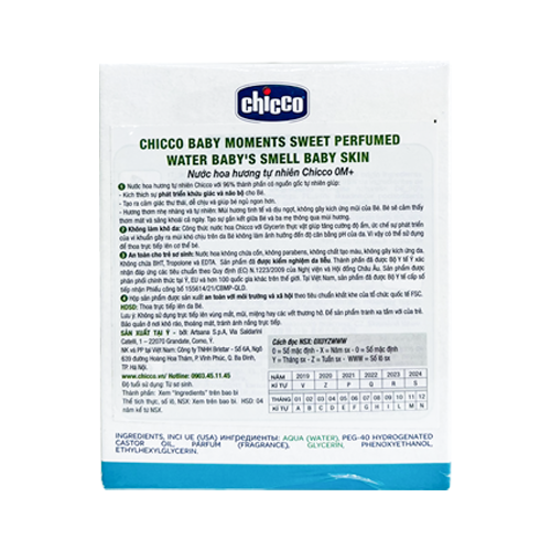Không làm khô da: Công thức nước hoa Chicco với Grycerin thực vật giúp tăng cường độ ẩm, ức chế sự phát triển của vi khuẩn gây ra mùi khó chịu trên da Bé không làm ảnh hưởng đến độ cân bằng pH của da. Vì vậy có thể sử dụng để thoa trực tiếp lên cơ thế Bé.
