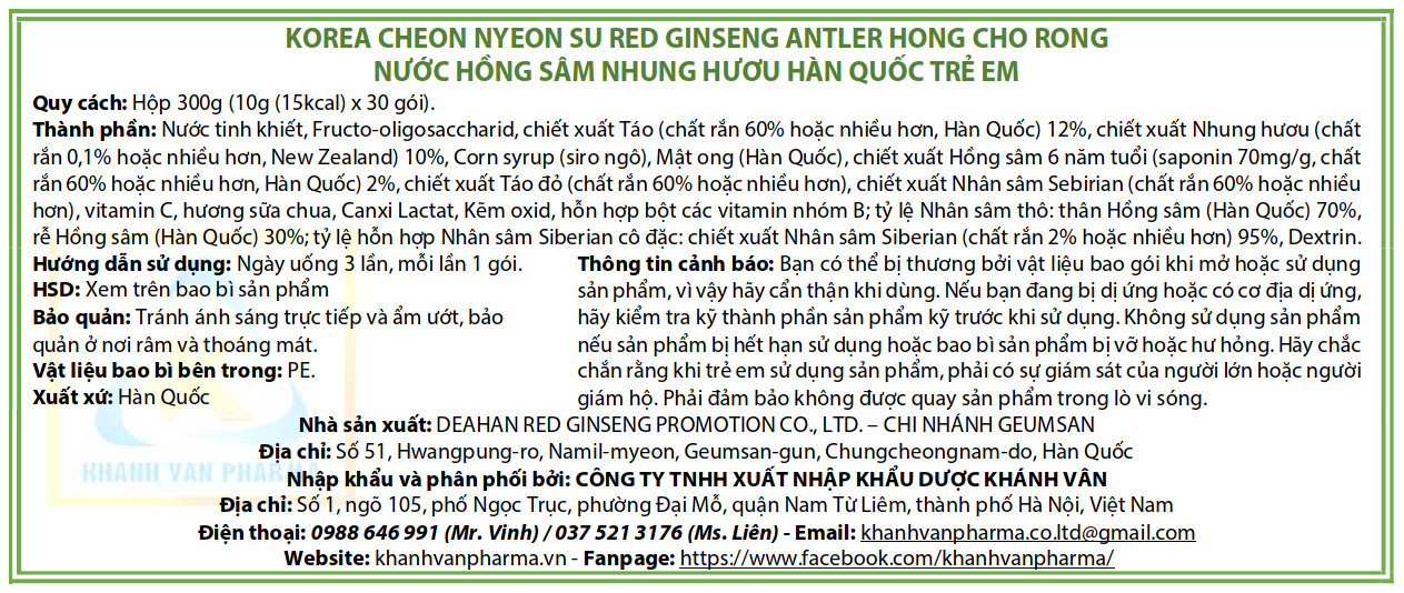 NƯỚC HỒNG SÂM NHUNG HƯƠU HÀN QUỐC TRẺ EM - KOREA CHEON NYEON SU RED GINSENG ANTLER HONG CHO RONG