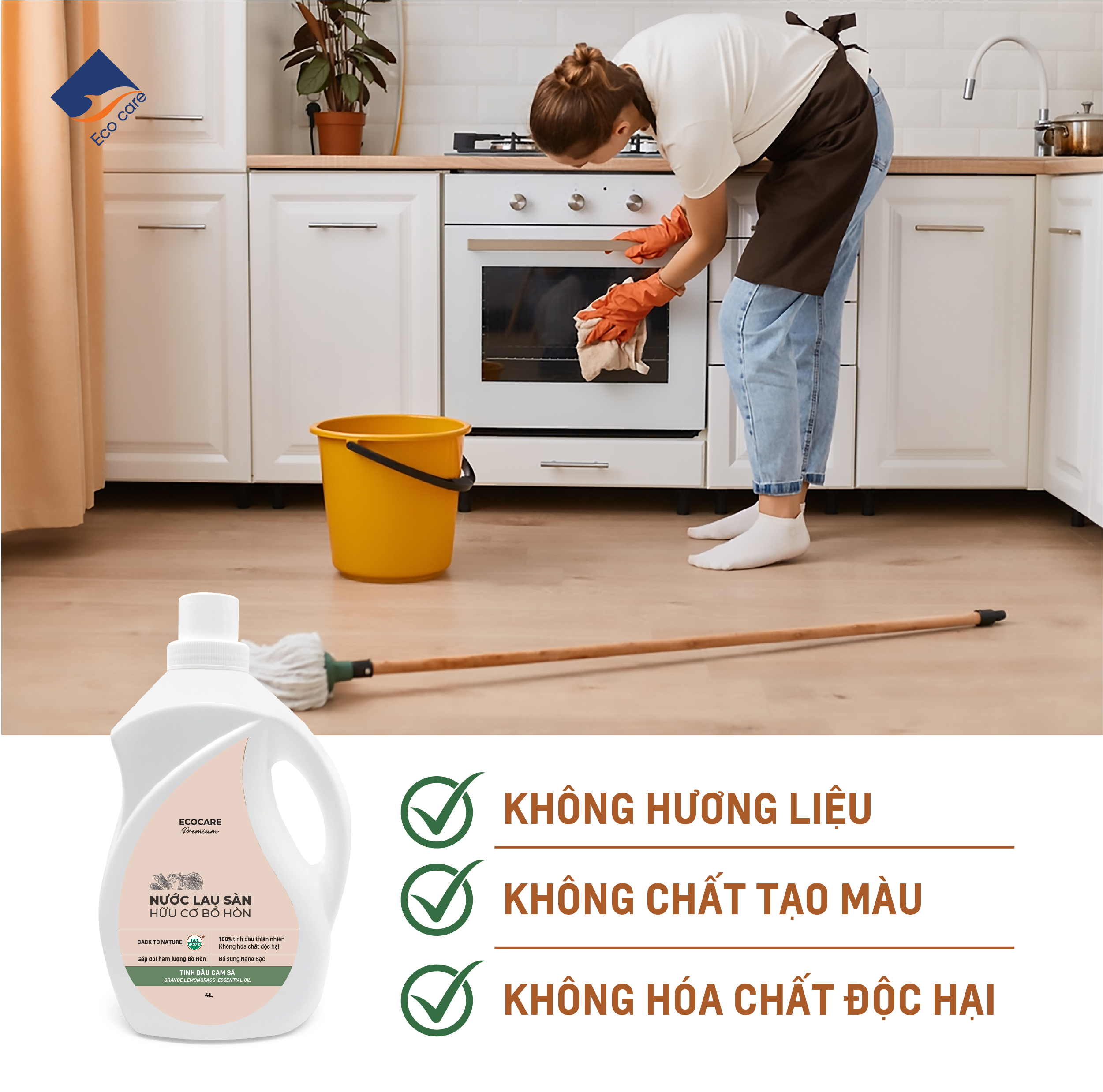 - Sản xuất trên dây chuyền đạt tiêu chuẩn ISO 14001: 2015 và ISO 9001: 2015. Sản phẩm Nước lau sàn hữu cơ Bồ hòn Ecocare cam kết: 5 CÓ: