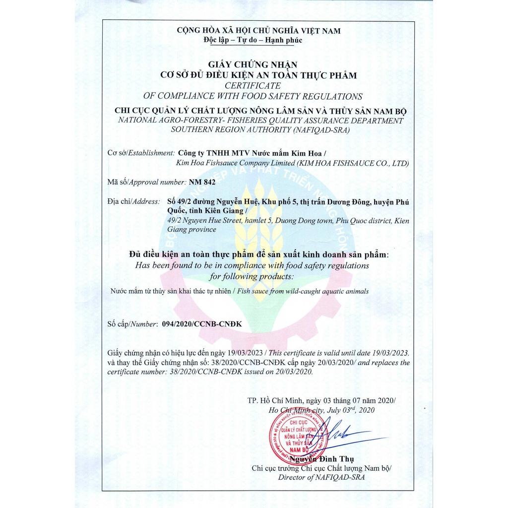 Nước Mắm Cá Đen Phan Thiết đạt chứng nhận tiêu chuẩn HACCP ( tiêu chuẩn VSATTP Châu Âu), OCOP 4 SAO (hạng mục tỉnh Bình Thuận), có giấy phép kiểm định của viện Pasteur HCM