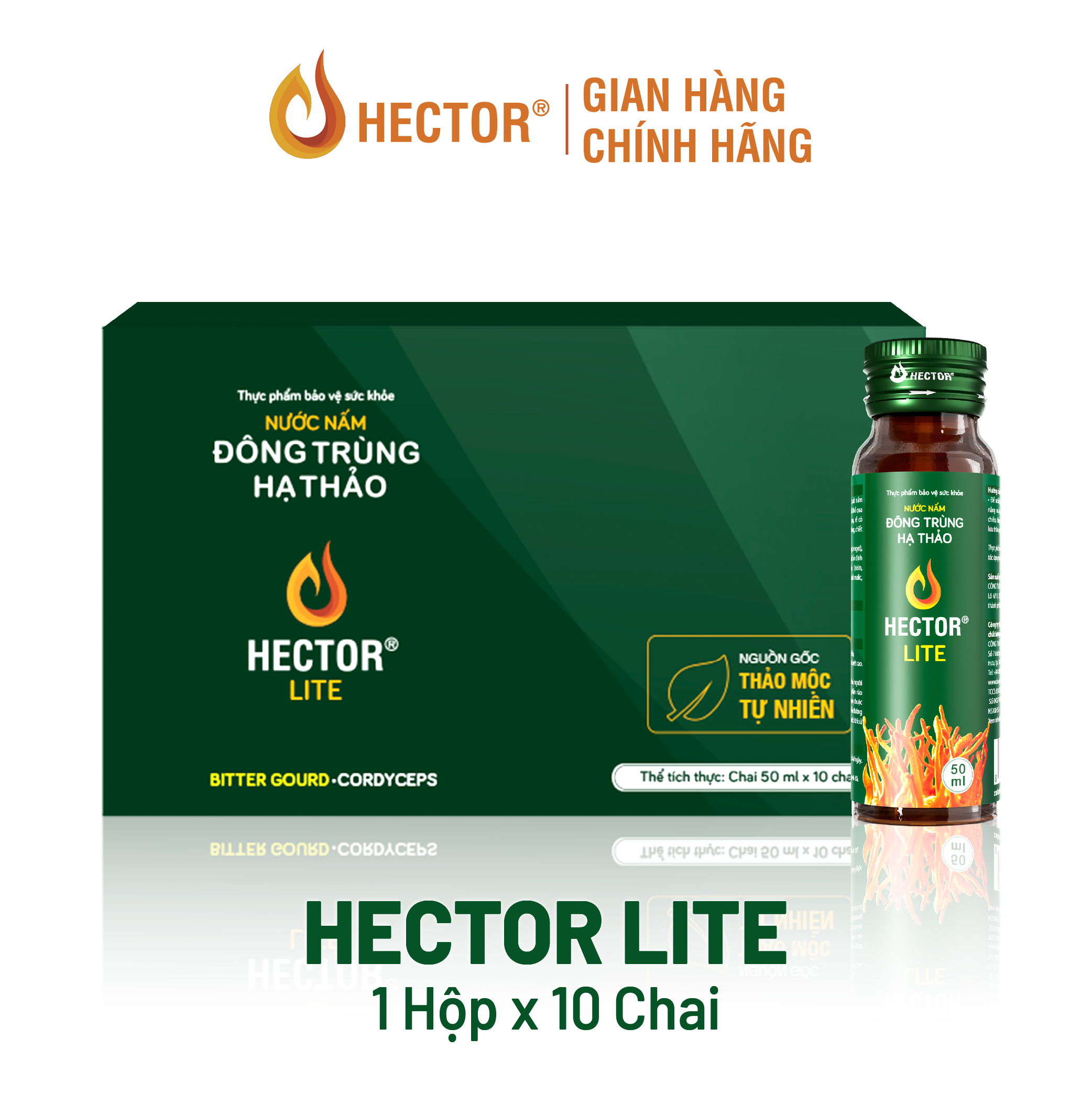 Nước nấm Đông trùng hạ thảo Hector Lite là sự kết hợp giữa chiết xuất nấm Đông trùng hạ thảo và các dược liệu thiên nhiên mang nhiều lợi ích cho sức khỏe. Hector Lite không có đường mía phù hợp cho người mong muốn kiểm soát chỉ số đường huyết trong cơ thể. Thành phần: Trong mỗi chai nước nấm Đông trùng hạ thảo Hector Lite 50ml chứa: chiết xuất Đinh lăng 900mg, chiết xuất nấm Đông trùng hạ thảo 500mg, chiết xuất Khổ qua 300mg, chiết xuất Chùm ngây 300mg, rễ Cỏ tranh 150mg, chiết xuất Đẳng sâm 150mg, chiết xuất Hoa Actiso 150mg. Phụ liệu: Nước tinh khiết, chất điều chỉnh độ acid (L-Acid Ascorbic, Acid Malic), chất ổn định (Xanthan gum), chất tạo ngọt tự nhiên (Đường cỏ ngọt), chất bảo quản ( Nisin, Natamycin), chất tạo ngọt tổng hợp (Sucralose). Công dụng nổi bật: Hỗ trợ bồi bổ cơ thể Hỗ trợ cải thiện chỉ số đường huyết Đối tượng sử dụng sản phẩm Hector Sâm: Người trưởng thành cần bồi bổ cơ thể Người trưởng thành có đường huyết cao Hướng dẫn sử dụng: Dùng hàng ngày, lượng dùng từ 1-2 chai vào sáng/trưa Ngon hơn khi uống lạnh, có thể dùng với đá Lắc đều trước khi sử dụng Hướng dẫn bảo quản: Sản phẩm có hạn sử dụng 12 tháng kể từ ngày sản xuất Bảo quản nơi khô ráo, thoáng mát, tránh ánh nắng mặt trời Quy cách : 01 hộp 10 chai x 50ml Khuyến cáo: Sản phẩm này không phải là thuốc. Không có tác dụng thay thế thuốc chữa bệnh. Không sử dụng cho phụ nữ có thai, người mẫn cảm kiêng kị với bất kỳ thành phần nào của sản phẩm. Người bị tiểu đường phụ thuộc insulin, người đang sử dụng thuốc tiểu đường hỏi ý kiến bác sĩ hoặc chuyên gia y tế trước khi sử dụng sản phẩm.