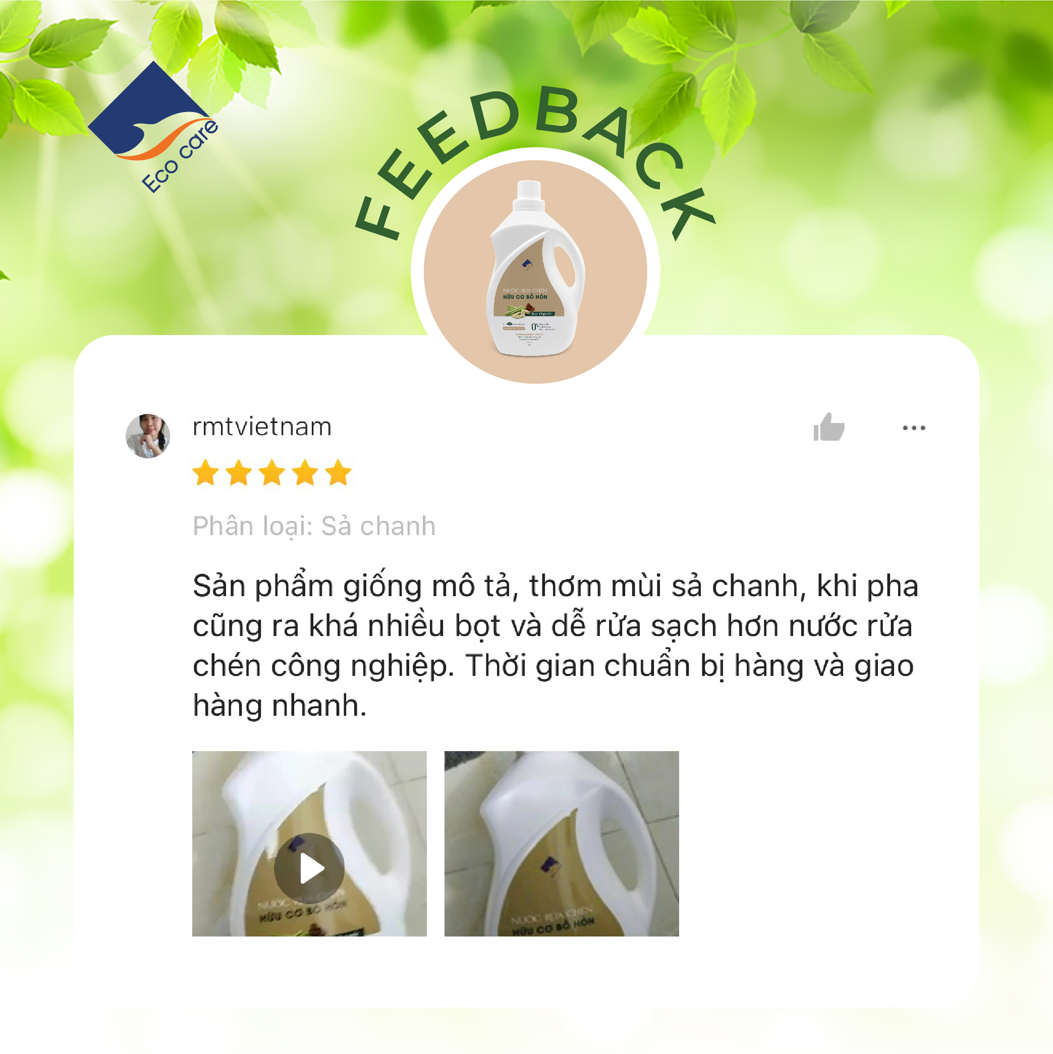 • Trước tiên, Công ty Ecocare xin cảm ơn Quý Khách hàng đã tin tưởng lựa chọn sản phẩm Nước rửa chén hữu cơ Bồ hòn tinh dầu Sả Chanh 2000ml