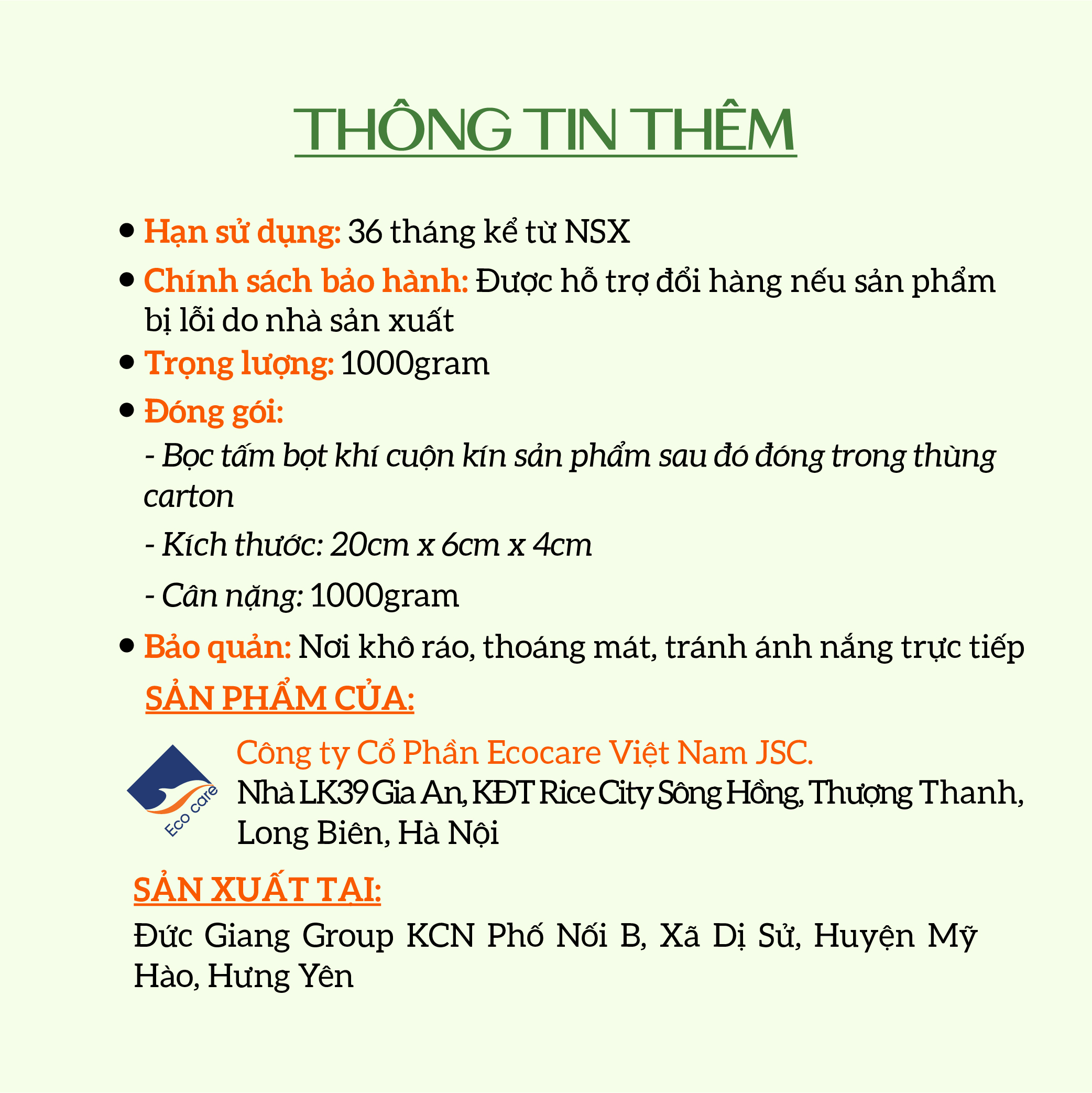 Sản phẩm của Công ty Cổ Phần Ecocare Việt Nam JSC. Nhà LK39 Gia An, KĐT Rice City Sông Hồng, Thượng Thanh, Long Biên, Hà Nội. Sản xuất tại Đức Giang Group KCN Phố Nối B, Xã Dị Sử, Huyện Mỹ Hào, Hưng Yên.