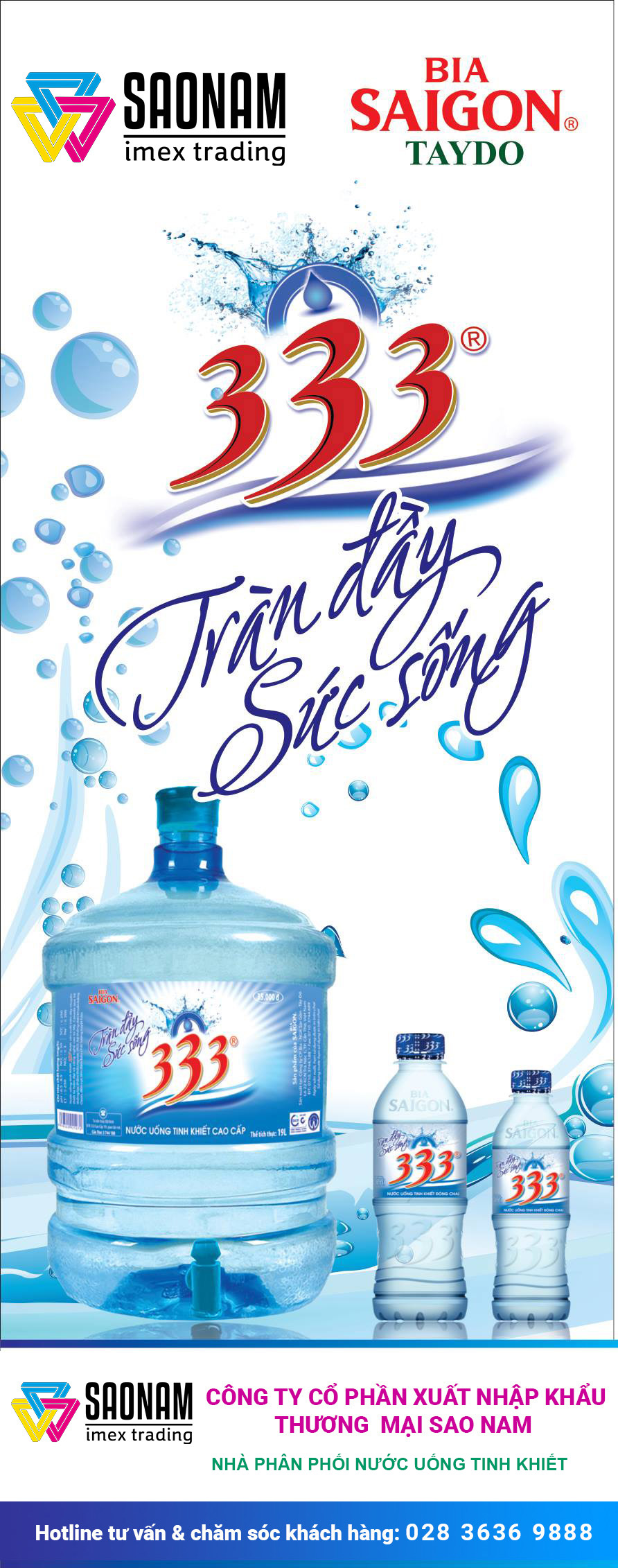 Mua tại TiktokNước uống tinh khiết 333 Là sản phẩm của Công ty CP Bia Nước Giải Khát Sài Gòn - Tây Đô sản xuất trên dây chuyền thiết bị công nghệ cao được nhập khẩu từ Mỹ, Canada. Nước uống tinh khiết 333 - loại 350ml - thùng 24 chai : giá bán lẻ 99.000đ/thùng Nước uống tinh khiết 333 - loại 500ml - thùng 24 chai : giá bán lẻ 119.000đ/thùng Nước uống tinh khiết 333 - bình 19 lít : giá bán lẻ 49.000đ/bình Nước uống tinh khiết Sài Gòn Water - bình 19 lít : giá bán lẻ 45.000đ/bình Nước uống tinh khiết 333 Được sản xuất theo quy trình quản lý chất lượng, an toàn thực phẩm theo tiêu chuẩn quốc tế ISO 9001-2008, ISO 22000-2005, ISO 17025, ISO 14000 và quy chế quản lý chất lượng theo tiêu chuẩn TDBECO cho sản phẩm Bia, Nước tinh khiết, nước giải khát. Nước uống tinh khiết 333 Hoàn toàn tự nhiên, không chứa các loại khoáng chất nhân tạo nên phù hợp với tất cả đối tượng người sử dụng, không lo ngại mất cân bằng khoáng trong cơ thể hoặc gia tăng nguy cơ sỏi thận. Nhà Phân Phối Nước Tinh Khiết 333 -Sản phẩm của Công ty CP Bia - Nước Giải Khát Sài Gòn Tây Đô Công ty CP Xuất Nhập Khẩu Thương Mại Sao Nam MST: 0314866865 Địa chỉ: 45 Trần Cao Vân, P.Võ Thị Sáu, Quận 3, Tp.HCM VPGD: 220 Trần Não, P. An Khánh, Thành phố Thủ Đức, Tp.Hồ Chí Minh ĐT: 028 35355958 – 36369888 - 0988 878989 Liên hệ Phòng kinh doanh: Khu vực Tp.HCM: Ms Trâm Anh – 0387 159 163 ; Ms Huỳnh Như – 0366 323 416 Khu vực Bà Rịa-Vũng Tàu: Ms Khanh – 0906 610 482 ; Mr Hoà – 0888 890 022 Khu vực Lâm Đồng: Mr Tài - 09 6638 6238 TUYỂN ĐẠI LÝ PHÂN PHỐI SỈ - LIÊN HỆ: 0987-832-157