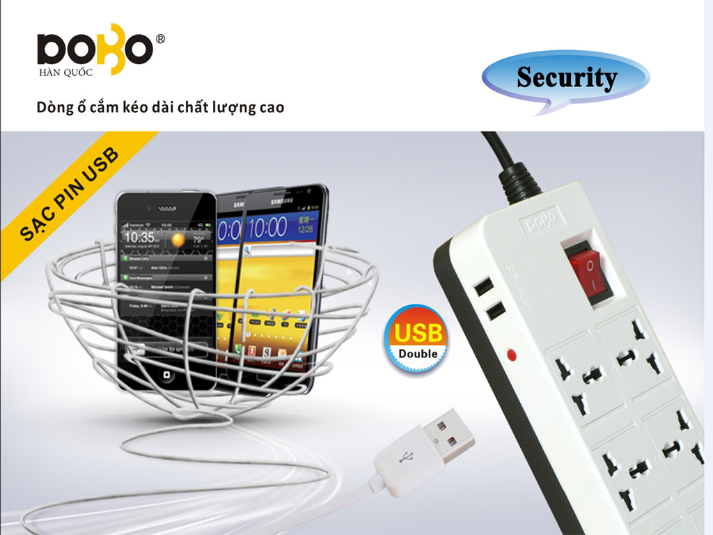 Ổ cắm 3 ổ đa năng + 2 ổ cắm USB cách điện bền đẹp - Chịu nhiệt, chống cháy: 750 độ C - Chiều dài dây điện: 1.8 mét - Chân tiếp xúc với