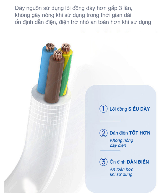 Bên trong dây nguồn của ổ cắm sử dụng lõi đồng nguyên chất, dày hơn gấp 3 lần, đảm bảo dẫn điện tốt nhưng không gây nóng, giúp nâng cao tuổi thọ của thiết bị.