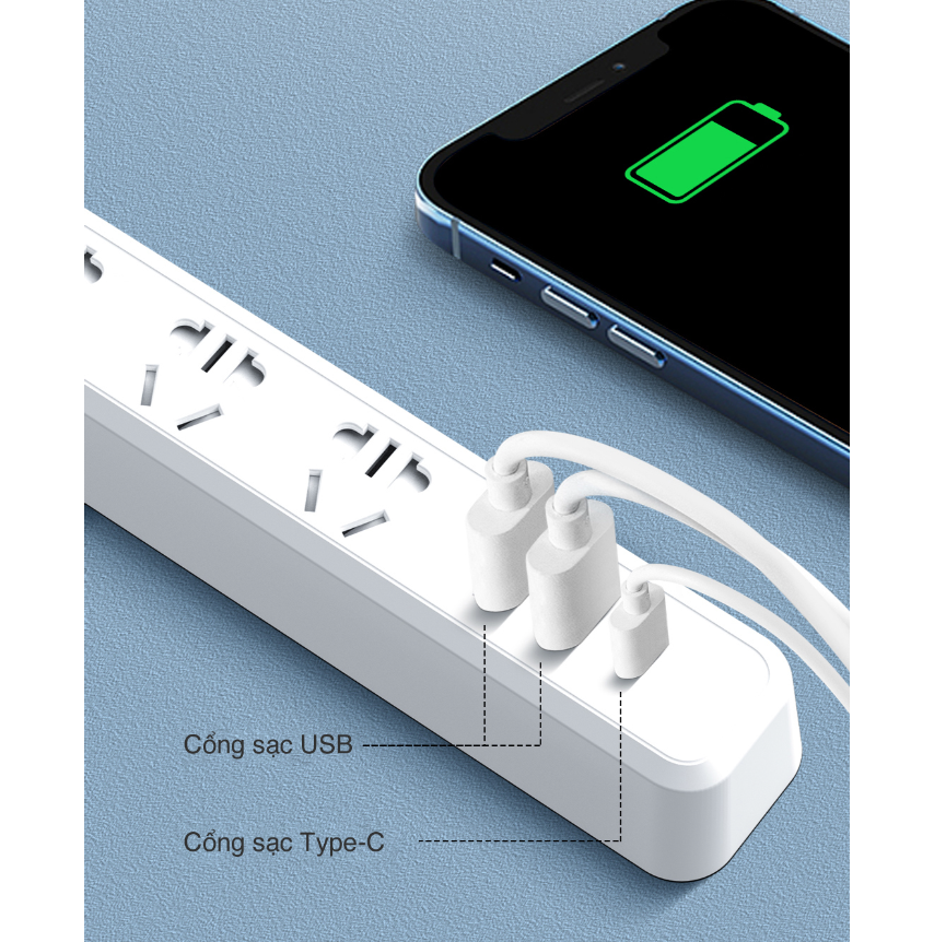 Ngoài 3 đầu cắm trên, sản phẩm còn được tích hợp thêm 3 cổng USB với tổng công suất lên đến 15W, giúp hỗ trợ sạc trực tiếp cho các thiết bị di động như điện thoại, máy tính bảng, smartwatch,… mà không cần đến cốc sạc.