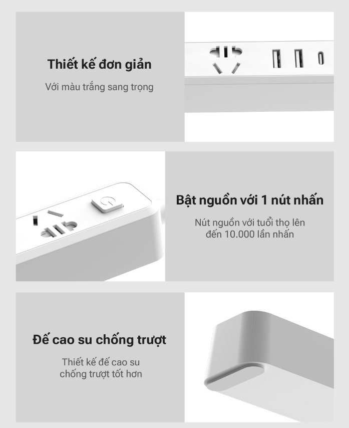 Sản phẩm với thiết kế 3 đầu cắm và 3 cổng USB, hỗ trợ tổng công suất lên đến 15W, đi kèm đầy đủ các trang bị bảo vệ an toàn,