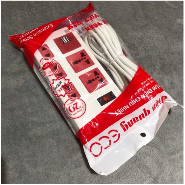 Ổ cắm điện chính hãng Điện Quang chất lượng uy tín miễn bàn - dây 2 mét, 5 lỗ, 2 cổng sạc USB