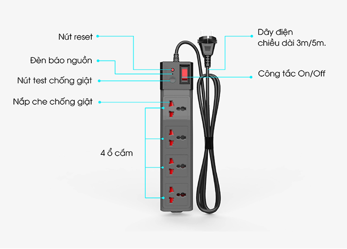 - Bảo vệ an toàn chống xung điện áp cao, xung sét. - Công tắc tích hợp rơ le chống quá tải 15A. - Ổ cắm đa năng sử dụng đồng chuyên dụng siêu đàn