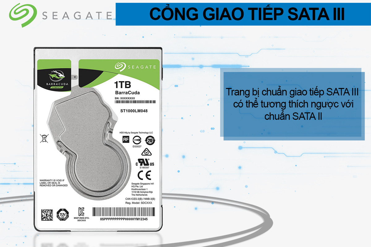 Ổ Cứng Trong Seagate BarraCuda 1TB/128MB/2.5/5400 - ST1000LM048 được trang bị chuẩn giao tiếp SATA III có thể tương thích ngược với chuẩn SATA II.