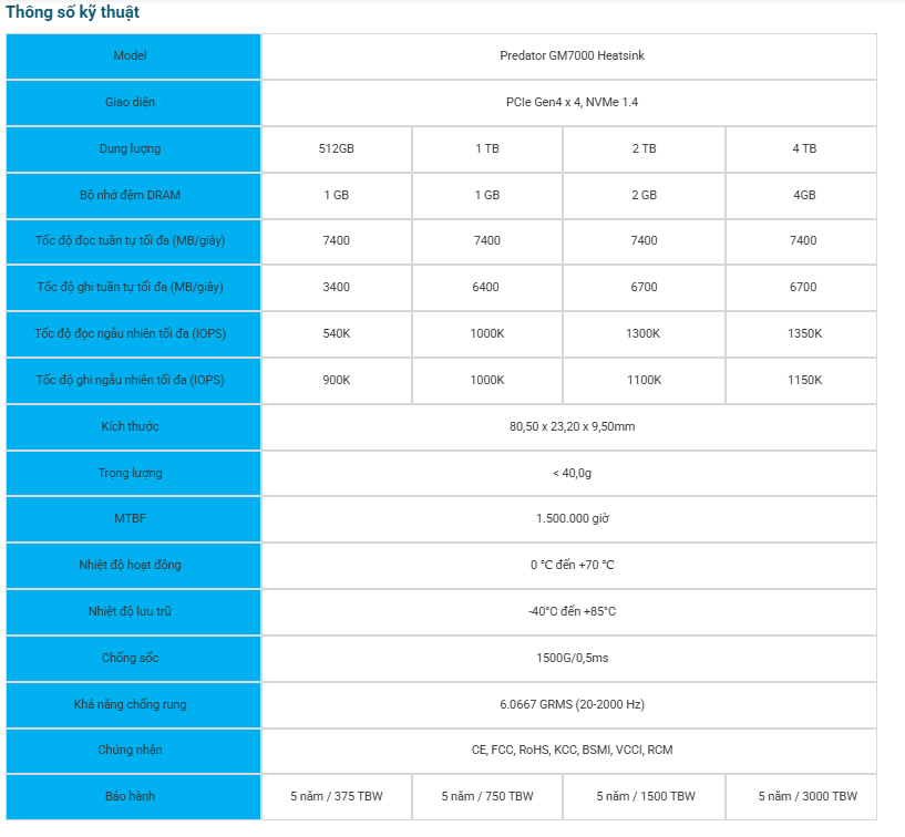 Predator GM7000 Heatsink là dòng SSD PCIe Gen 4 tốt nhất Hãng với tốc độ đọc lên đến 7400 MB/giây và dung lượng lên đến 4 TB cho trải nghiệm chơi game mượt mà. Với tản nhiệt tùy chỉnh và bộ nhớ đệm DRAM độc lập, GM7000 Heatsink có khả năng tản nhiệt tốc độ cao và đọc và ghi ngẫu nhiên hiệu quả. Ngoài ra, bạn sẽ nhận được phần mềm tùy chỉnh miễn phí của Predator để truyền dữ liệu nhanh chóng và bảo hành có giới hạn 5 năm.