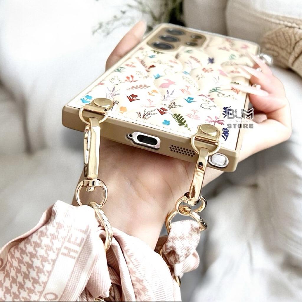 Ốp Lưng TPU Chỉ Nổi Họa Tiết Hoa Kèm Quai Khăn Lụa Sang trọng Cho Samsung S25 Ultra / S24 Ultra / S23 Ultra Chất Liệu : Nhựa TPU dẻo dày dặn Mặt lưng simili