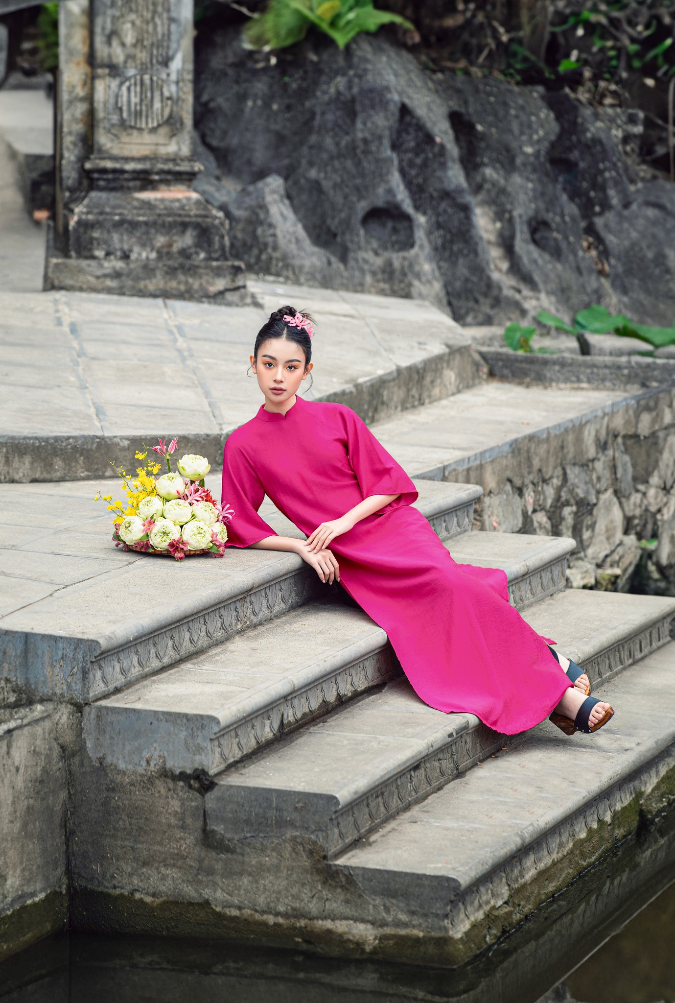 Áo dài form suông đỏ đô may bằng chất liệu lụa gấm loại 1 kết hoa và chim, tay lỡ loe, quần lụa hồng nhạt
