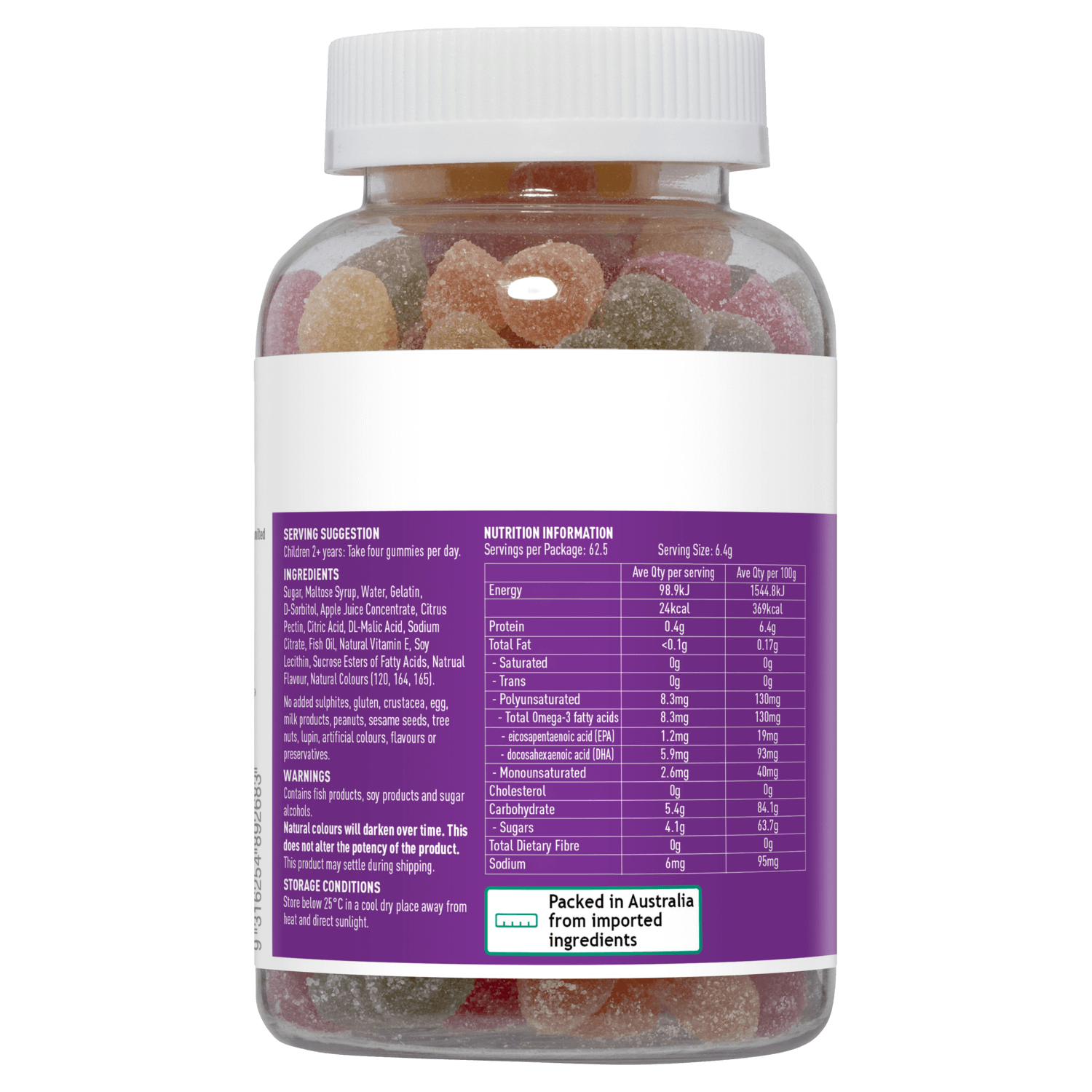 - Đường, xi-rô mạch nha, Nước, Gelatin, D-Sorbital, Nước ép táo cô đặc, Citrus Pectin, Axit Citric, Axit DL-Malic, Natri Citrate, Dầu cá, Lecithin đậu nành, Sucrose Este của Axit béo, Hương vị tự nhiên, Màu sắc tự nhiên (E120, E141, E100).