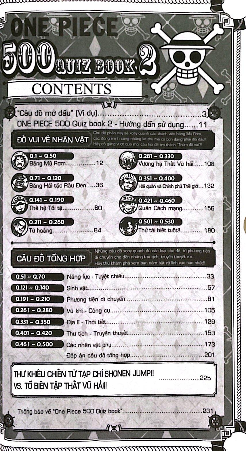 Các câu đố vui trong cuốn sách được phân chia thành những chủ đề khác nhau như: Chủ đề về các thành viên băng Hải tặc Mũ Rơm, Thất Vũ hải, Hải quân hay Tứ hoà Toàn bộ những chuyến phiêu lưu, trận chiến đình đám trong tác phẩm sẽ trở thành những thử thách đủ sức làm khó những Fan kì cựu nhất!!