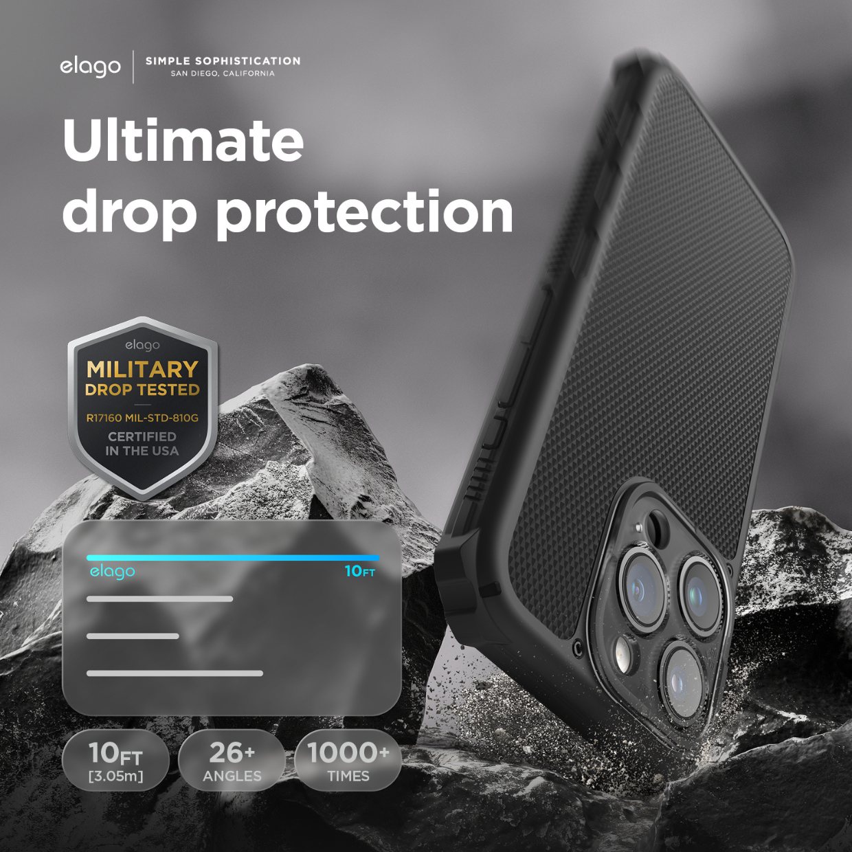 Thiết kế với hệ thống bảo vệ 3 lớp chắc chắn, hấp thụ lực tác động ở từng tầng: - Viền chống sốc 360º - Bảo vệ góc được gia cố - Cấu trúc hấp