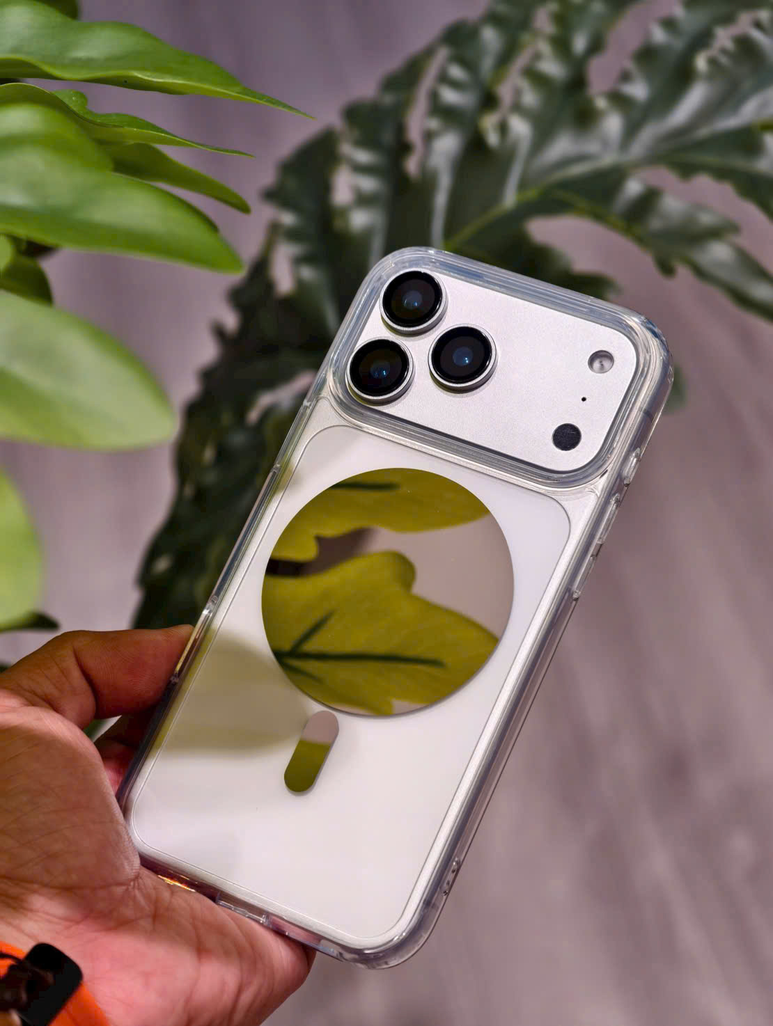 Ốp lưng iphone 17 pro max trong suốt, gắn sạc từ tính kiêm giá đỡ.
