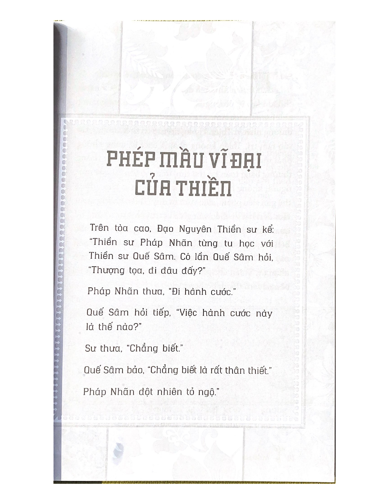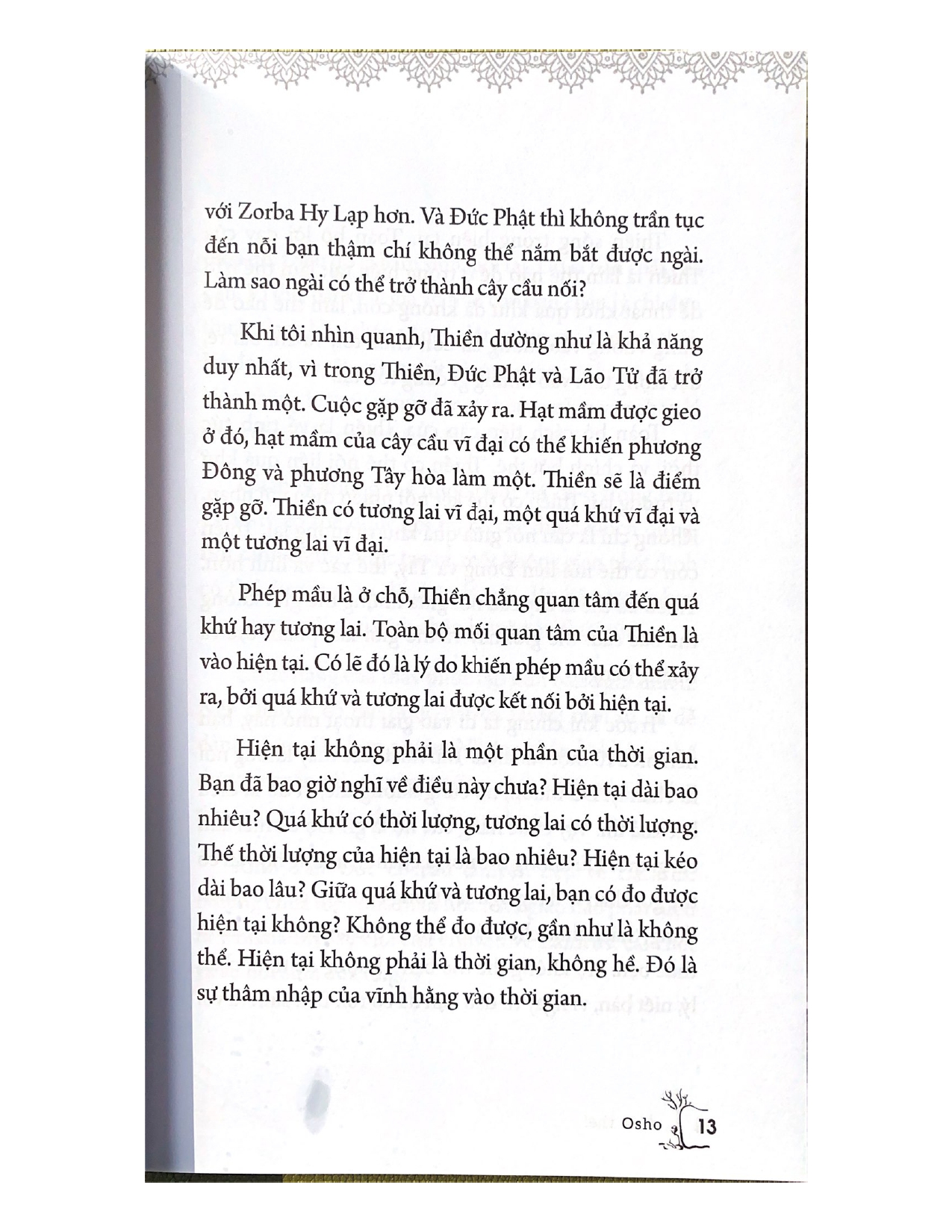 Hơn tất thảy các truyền thống tôn giáo và tâm linh khác, Thiền đóng vai trò vô cùng thiết thực với thời đại ngày nay, khi những cách tiếp cận xưa cũ không còn có thể giải quyết triệt để vấn đề. Tức thì, cấp bách và trực tiếp, Thiền không quan tâm đến câu hỏi hay câu trả lời, cũng chẳng màng đến giáo huấn hay dạy dỗ, bởi lẽ Thiền không phải là triết lý.