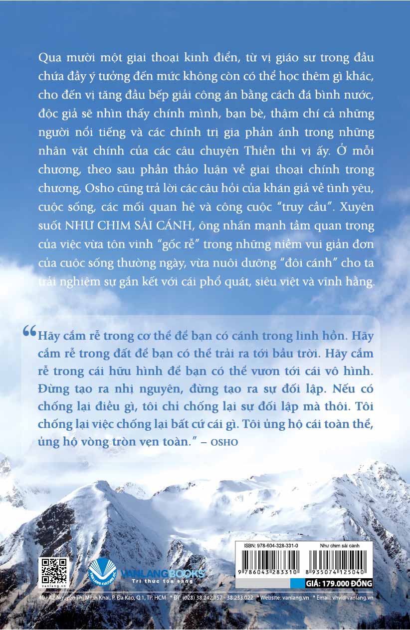Qua mười một giai thoại kinh điển, từ vị giáo sư trong đầu chứa đầy ý tưởng đến mức không còn có thể học thêm gì khác, cho đến vị tăng đầu bếp giải công án bằng cách đá bình nước, độc giả sẽ nhìn thấy chính mình, bạn bè, và thậm chí cả những người nổi tiếng và các chính trị gia phản ánh trong những nhân vật chính của các câu chuyện Thiền thi vị ấy. Ở mỗi chương, theo sau phần thảo luận về giai thoại chính trong chương, Osho cũng trả lời các câu hỏi của khán giả về tình yêu, cuộc sống, các mối quan hệ và công cuộc “truy cầu”. Xuyên suốt NHƯ CHIM SẢI CÁNH, ông nhấn mạnh tầm quan trọng của việc vừa tôn vinh “gốc rễ” trong những niềm vui giản đơn của cuộc sống thường ngày, vừa nuôi dưỡng “đôi cánh” cho ta trải nghiệm sự gắn kết với cái phổ quát, siêu việt và vĩnh hằng.