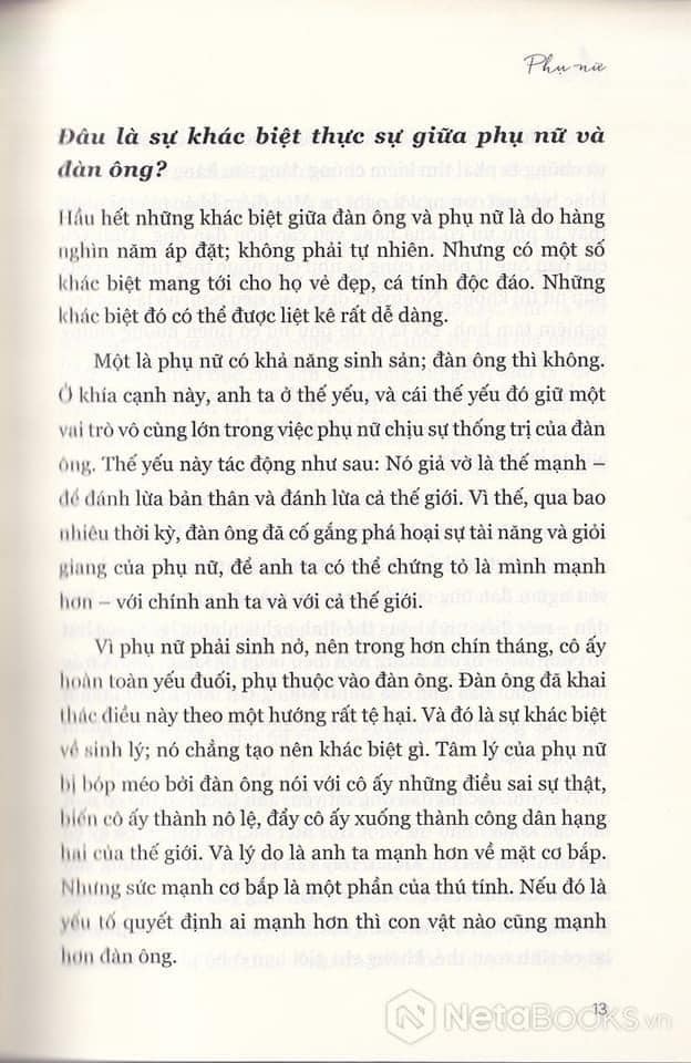 Nếu người phụ nữ không được tự do để là một người phụ nữ thực sự, đàn ông cũng sẽ không bao giờ được tự do làm một người đàn ông đích thực. Tự do của phụ nữ là điều kiện bắt buộc cho tự do của đàn ông; nó có tính nền tảng hơn tự do của đàn ông. Và nếu phụ nữ là nô lệ – như mấy thế kỷ qua – cô ấy cũng sẽ biến đàn ông thành nô lệ, bằng những cách thức rất tinh vi. Cô ấy sẽ không chiến đấu trực tiếp với bạn; cách chiến đấu của cô ấy sẽ là gián tiếp, nó sẽ rất nữ tính. Cô ấy khóc lóc và sụt sùi. Cô ấy sẽ không đánh bạn, cô ấy sẽ tự đánh mình, và với những hành động như thế của cô ấy, đến người đàn ông mạnh nhất cũng sẽ bị xỏ mũi. Một người phụ nữ mình hạc xương mai có thể thống trị một người đàn ông rất lực lưỡng.