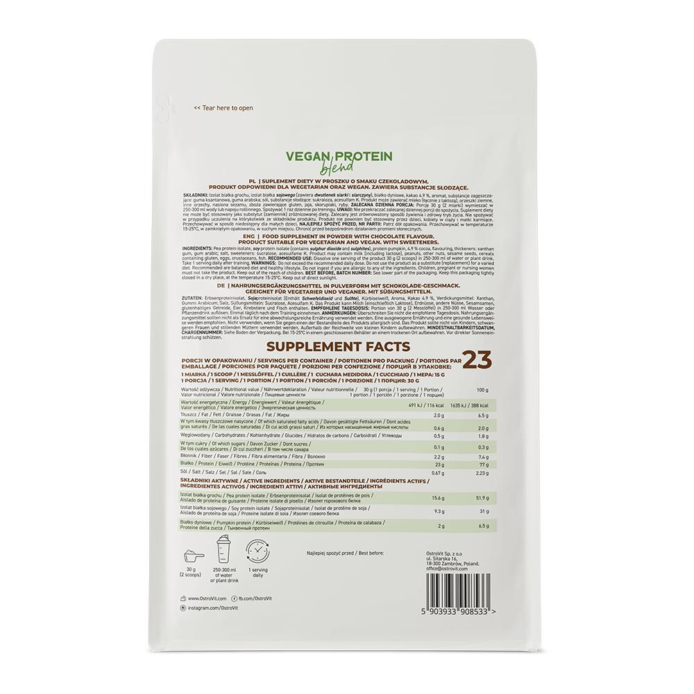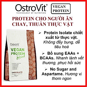 - OstroVit Vegan Protein Blend là hỗn hợp chất lượng cao các protein lành mạnh có nguồn gốc thực vật, hàm lượng protein cao chứa gần 80% protein (Protein Isolate đậu Hà Lan, Protein Isolate đậu nành và Protein Isolate bí ngô).