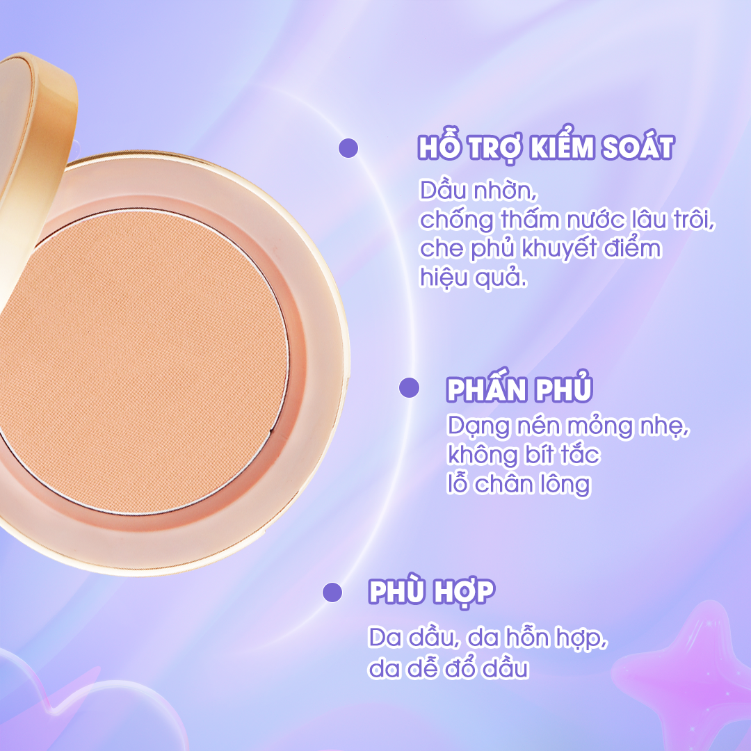 - Phấn phủ kiềm dầu, giảm bóng nhờn: Giữ lớp nền khô thoáng, không lo đổ dầu suốt cả ngày.