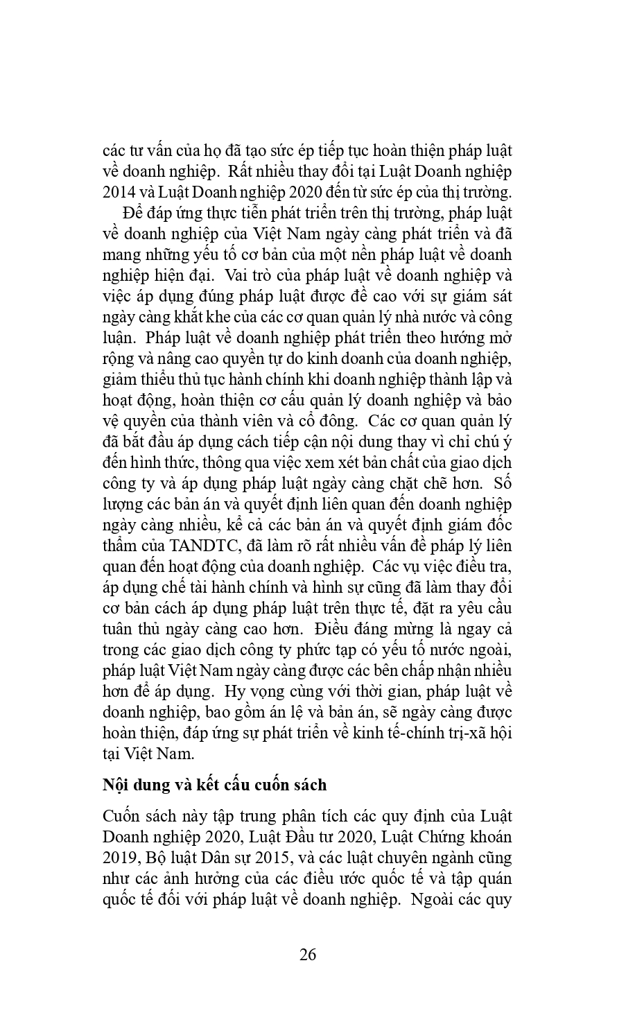 Trải dài trong hơn 1000 trang, cuốn sách phân tích các vấn đề pháp lý cơ bản liên quan đến việc thành lập, tổ chức quản lý và hoạt động của doanh nghiệp. Kết cấu của cuốn sách gồm hai mươi chương và chia làm năm phần, tập trung vào hai hình thức doanh nghiệp thông dụng nhất là công ty trách nhiệm hữu hạn (CTTNHH) và công ty cổ phần (CTCP).