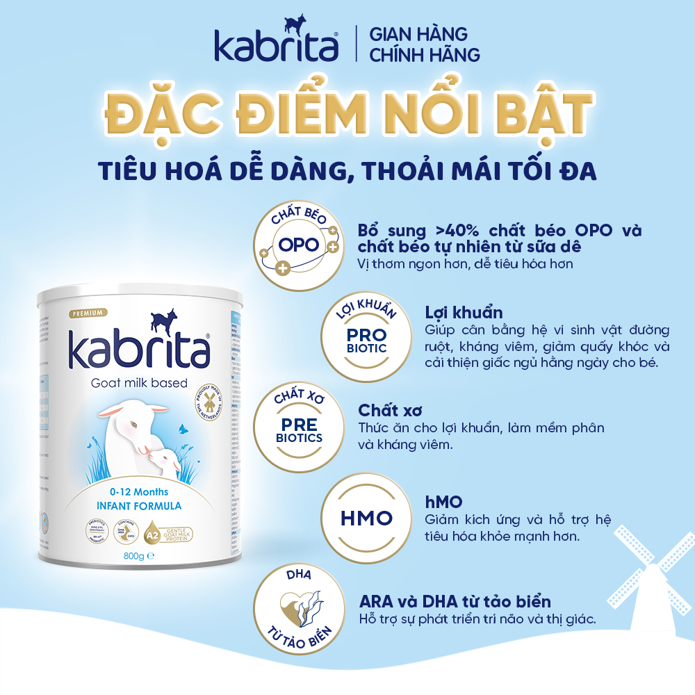 - Bổ sung 22 vitamin & khoáng chất cần thiết cho sự phát triển của trẻ Sữa dê Kabrita - Nhãn sữa dê số 1 thế giới - Nhập khẩu chính hãng từ Hà Lan. Sữa dê Kabrita là một thương hiệu thuộc tập đoàn Ausnutria - chuyên sản xuất & tiếp thị các sản phẩm sữa công thức với lịch sử hơn 100 năm. Sữa dê Kabrita hiện có mặt chính thức ở 44 quốc gia trên thế giới, bao gồm Việt Nam, được nhập khẩu chính hãng với giấy tờ đầy đủ & được Bộ Công thương cấp phép. Sữa dê Kabrita được sản xuất 100% từ các trang trại dê hiện đại, đạt chuẩn châu Âu tại Hà Lan - trang trại sữa của thế giới. Sữa dê Kabrita có vị thơm ngon, béo, dịu nhẹ, thanh mát, dễ uống. Sữa dê Kabrita với những đặc tính dịu nhẹ có sẵn từ sữa dê, cùng những sáng tạo tân tiến độc quyền, tạo nên một sản phẩm dinh dưỡng dịu nhẹ tối ưu cho hệ tiêu hóa còn non nớt của bé. Hàng triệu ba mẹ trên thế giới đã tin dùng sữa dê Kabrita cho con mình. Còn bạn thì sao? Thử ngay sữa dê Kabrita cho con bạn nhé!