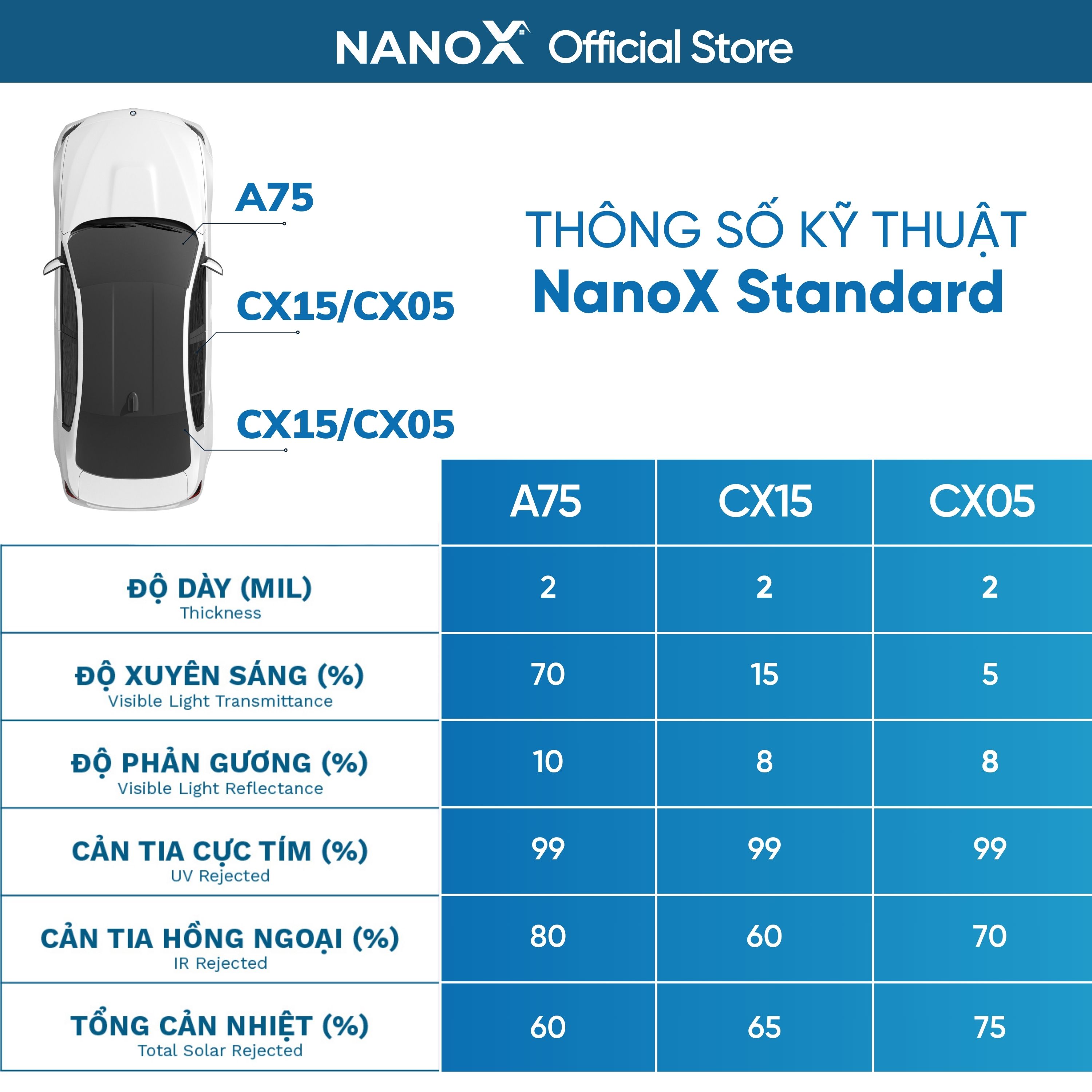 - Lợi ích: Không gian mát dịu, bảo vệ da - mắt & bảo vệ sức khoẻ, tầm nhìn rõ, giảm tải thiết bị làm mát (điều hoà) - tiết kiệm nhiên liệu, tăng sự riêng tư và an ninh… Thông số kỹ thuật NanoX Standard 7 chỗ: