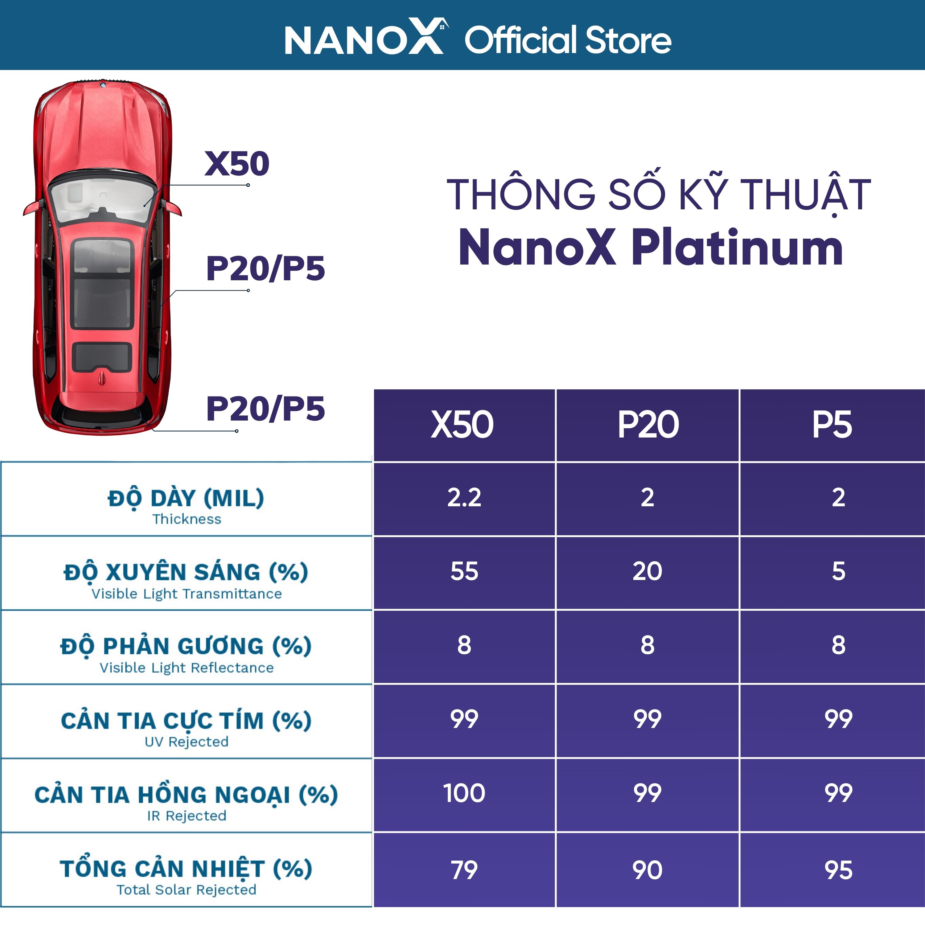 - Lợi ích: Không gian mát dịu, bảo vệ da - mắt & bảo vệ sức khoẻ, tầm nhìn rõ, giảm tải thiết bị làm mát (điều hoà) - tiết kiệm nhiên liệu, tăng sự riêng tư và an ninh… Thông số kỹ thuật NanoX Platinum 7 chỗ: