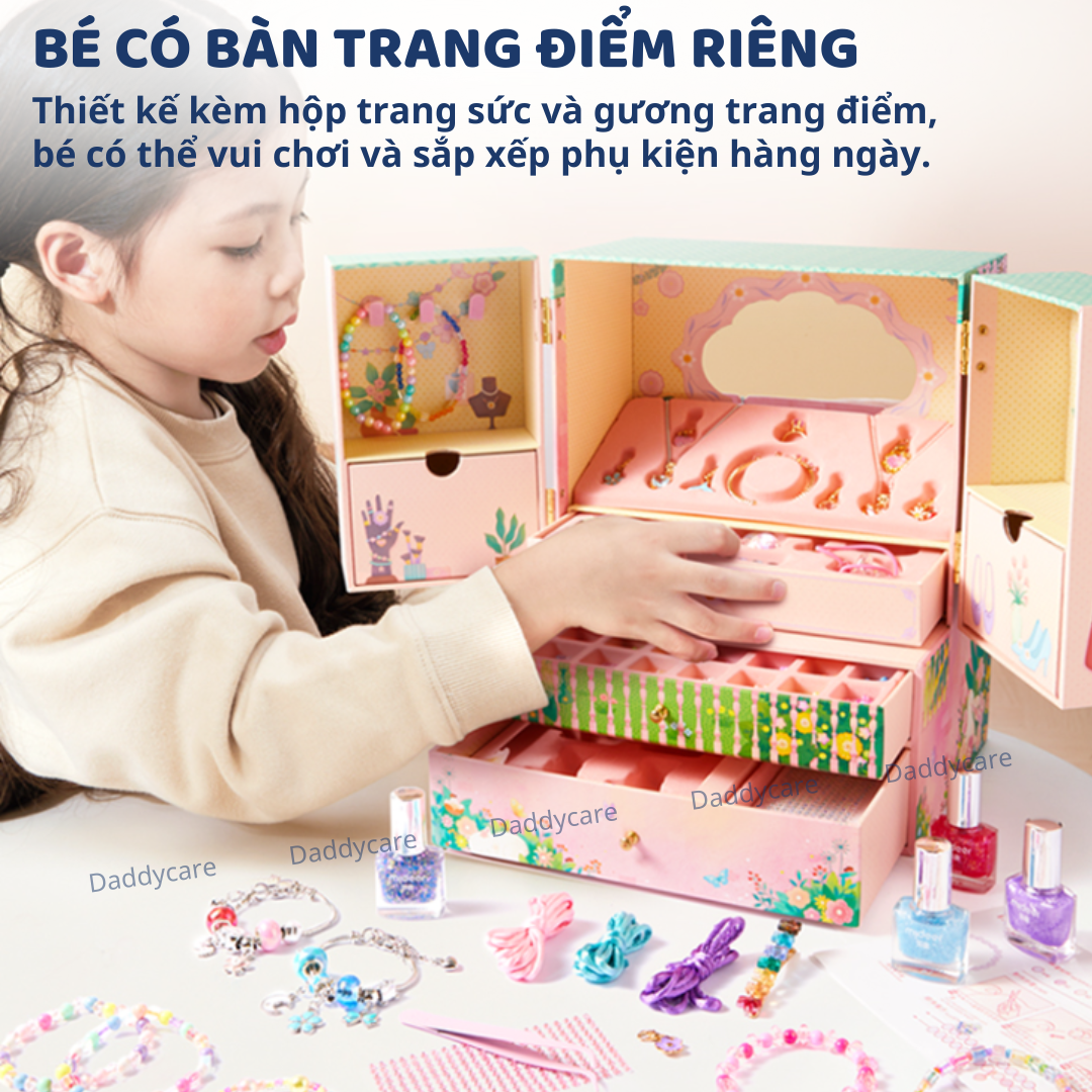 - BÉ CÓ BÀN TRANG ĐIỂM RIÊNG!: Thiết kế kèm hộp trang sức và gương trang điểm, bé có thể vui chơi và sắp xếp phụ kiện hàng ngày.