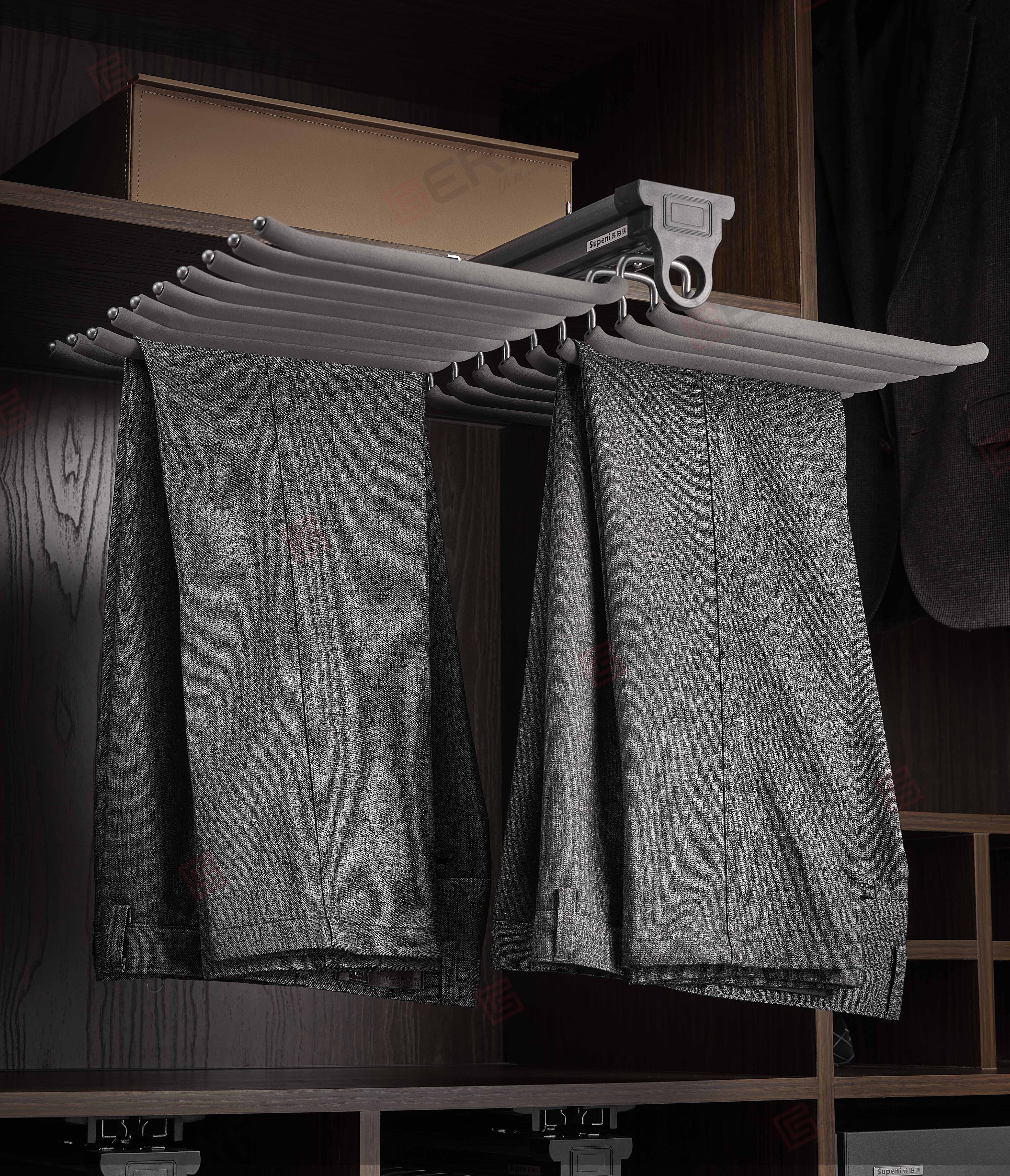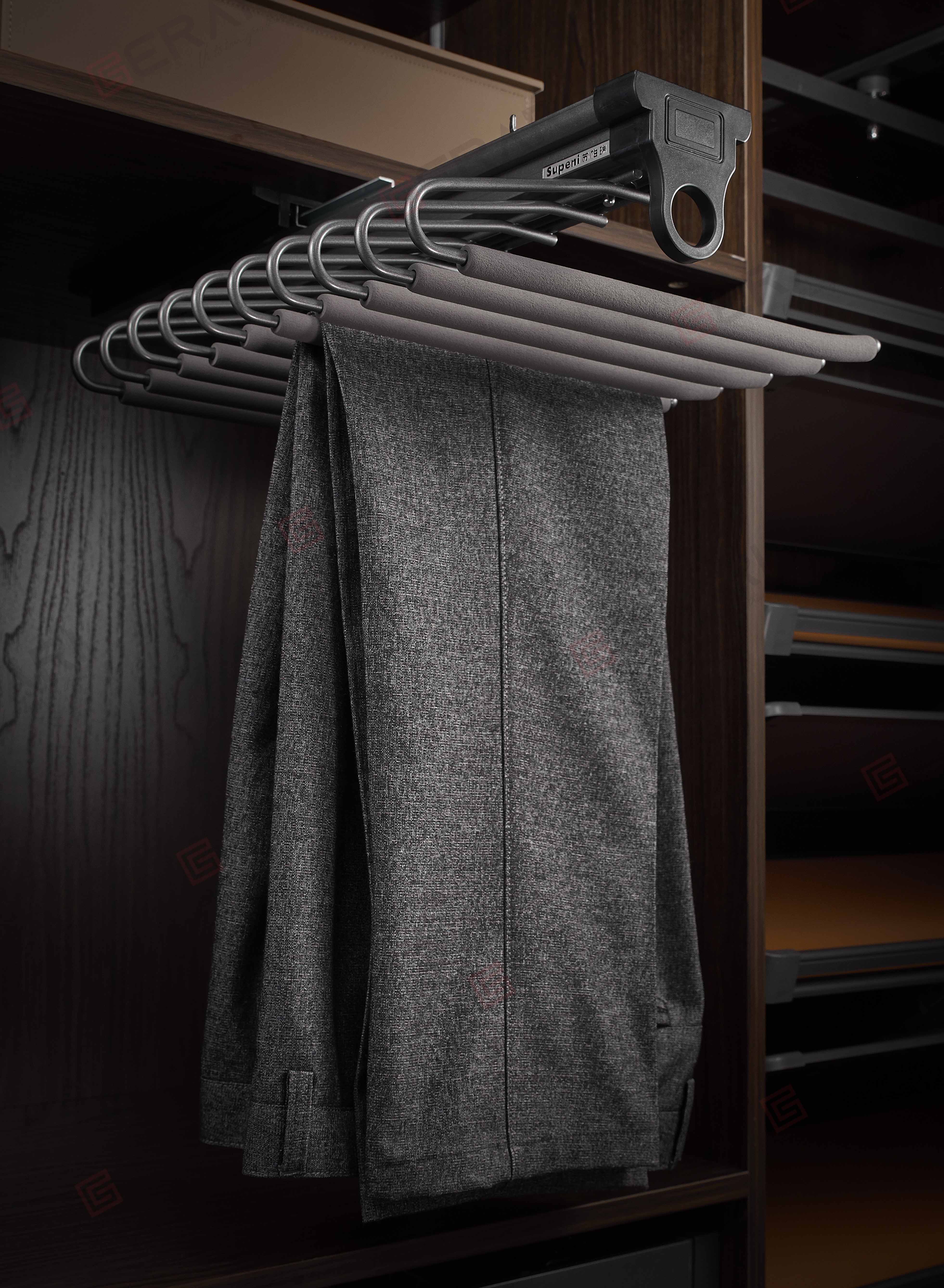 Phụ kiện của tủ áo - Giá treo quần âu âm tủ ray giảm chấn là bộ giá treo đa dụng được thiết kế tích hợp âm vào tủ quần áo với hệ ray trượt