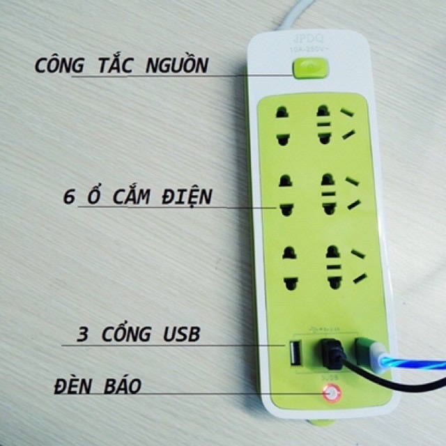-Sản phẩm bao gồm 6 lỗ cắm 2 chấu ( tròn hoặc dẹp đều được ) , 3 lỗ cắm 3 chấu dẹp và 3 cổng USB