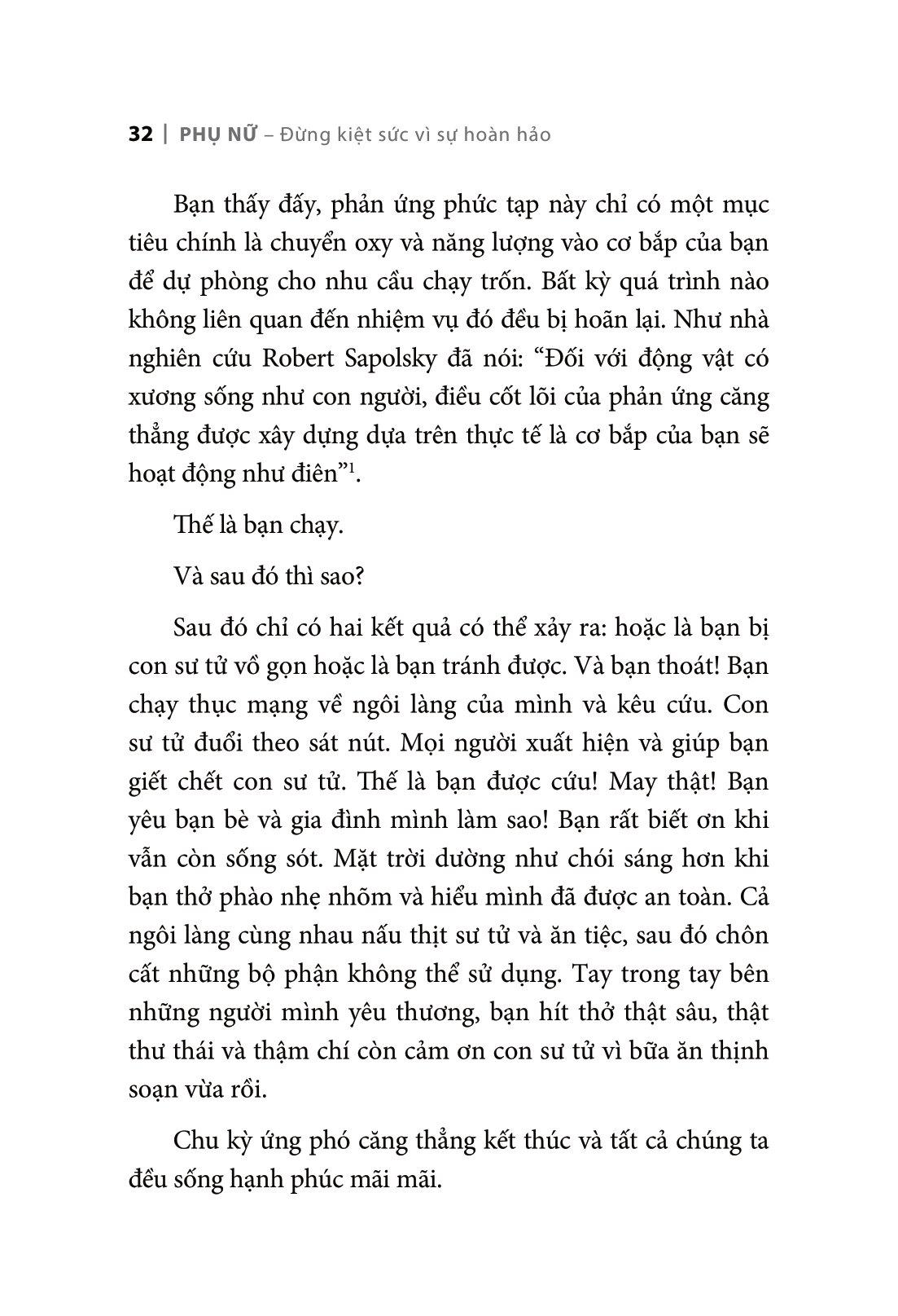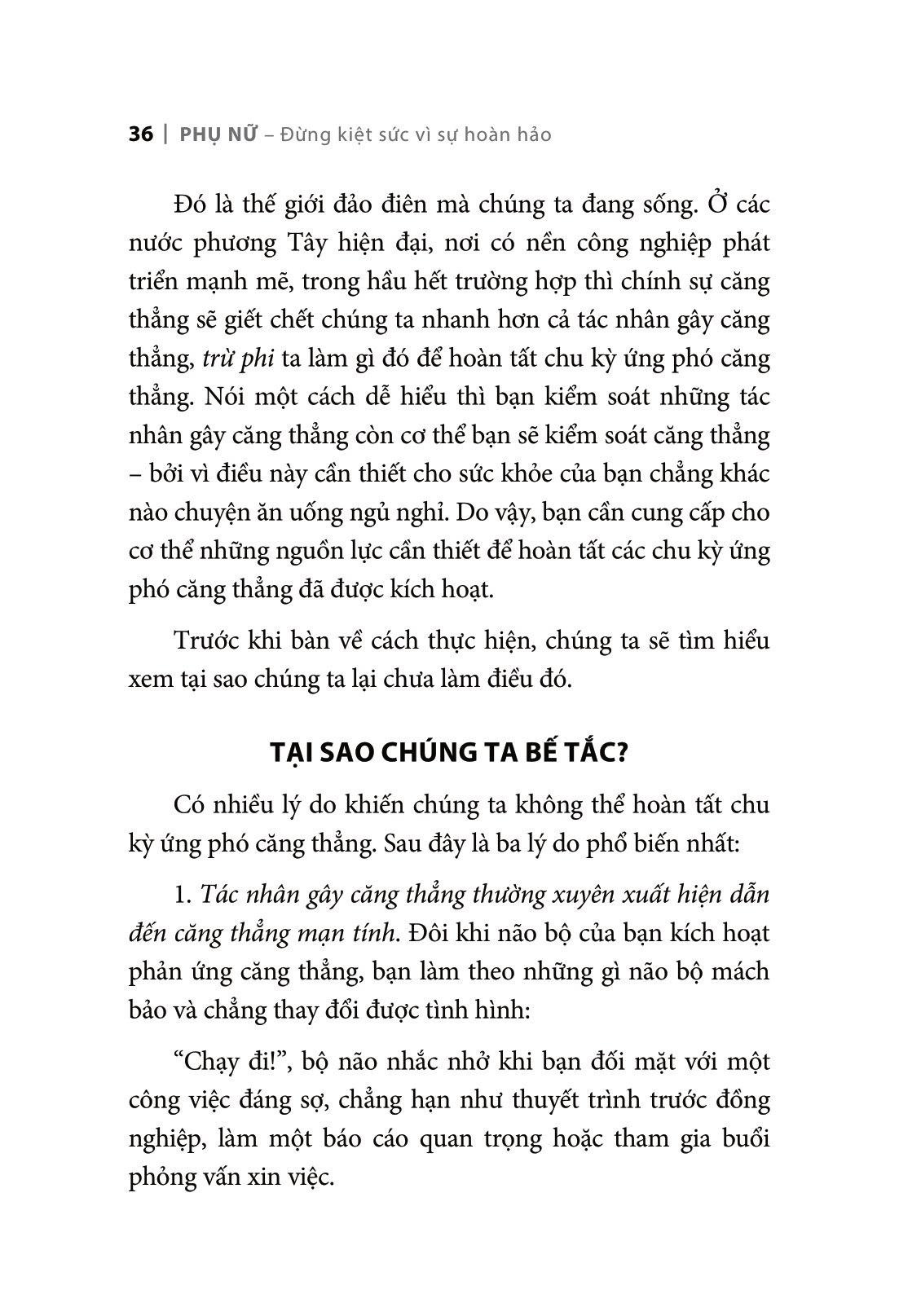 Phụ Nữ - Đừng Kiệt Sức Vì Sự Hoàn Hảo Tình trạng kiệt sức ở phụ nữ Trước đây, hầu hết các nghiên cứu về tình trạng Burnout đều khai thác khía cạnh kiệt sức trong công việc và đặc biệt quan tâm đến “những người làm công việc hỗ trợ những người khác” như giáo viên hay y tá. Nhưng khía cạnh “kiệt sức trong vai trò cha mẹ” cũng đang được nghiên cứu khoa học quan tâm. Trọng bốn mươi năm kể từ khi thuật ngữ này ra đời, nghiên cứu tìm ra yếu tố đầu tiên của tình trạng Burnout – cạn kiệt cảm xúc – chính là tác nhân lớn nhất gây ra tác động tiêu cực đối với sức khỏe, mối quan hệ và công việc của con người, đặc biệt là phụ nữ. Cuốn sách dành cho những phụ nữ cảm thấy đang kiệt sức “Phụ nữ - Đừng kiệt sức vì sự hoàn hảo” là cuốn sách dành cho bất kỳ người phụ nữ nào cảm thấy quá tải và kiệt sức với mọi công việc m.ình phải làm, nhưng vẫn cứ lo là m.ình chưa làm “đủ”. Cuốn sách này không giống với bất kỳ cuốn sách nào khác mà bạn từng đọc về tình trạng “Burnout” (tình trạng kiệt sức). Chúng ta sẽ cùng nhau tìm hiểu trong cuộc đời của chính bạn, như thế nào mới thực sự là sức khỏe và hạnh phúc. Chúng ta sẽ đối mặt với những rào cản ngăn cách bạn và sự viên mãn. Chúng tôi sẽ đưa những rào cản này vào bối cảnh thực tế để chúng tôi có thể khám phá cụ thể hơn. Và kèm theo đó là khoa học. Cuốn sách “Phụ nữ - Đừng kiệt sức vì sự hoàn hảo” được chia làm 3 phần: Phần đầu cuốn sách giải thích 3 nguồn nội lực mà chúng ta mang theo bên m.ình: chu kỳ ứng phó căng thẳng, “bộ kiểm tra” (cơ chế kiểm soát cảm xúc thất vọng của não) và ý nghĩa của cuộc sống. Phần 2 cuốn sách chỉ ra nguyên nhân, “phụng thù thực sự” khiến phụ nữ trở nên cống hiến cảm xúc. Phần 3 là kiến thức để đánh bại những “quân thù thực sự” này. Hóa ra có những công việc cụ thể mà chúng ta có thể làm hằng ngày để trở nên mạnh mẽ và chiến thắng kẻ thù. Xuyên suốt cuốn sách BURNOUT: Bí quyết mở khóa chu kỳ căng thẳng, bạn sẽ theo dõi câu chuyện của hai người phụ nữ: Julie, một giáo viên trường công lập luôn bị quá tải, đến mức có thể sa lầy đến mức báo động; và Sophie, một kỹ sư quyết định m.ình không thể mãi mãi bị thao túng bởi chế độ phụ quyền. Những phụ nữ này là tác phẩm tổng hợp từ những mảnh ghép của hàng chục phụ nữ ngoài đời thực, được biên soạn thành một câu chuyện hoàn chỉnh. Hãy cùng hai tác giả Emily Nagoski, PhD và Amelia Nagoski Peterson, DMA cuộc khởi nghĩa cuộc sống cạn kiệt của bạn nhé!