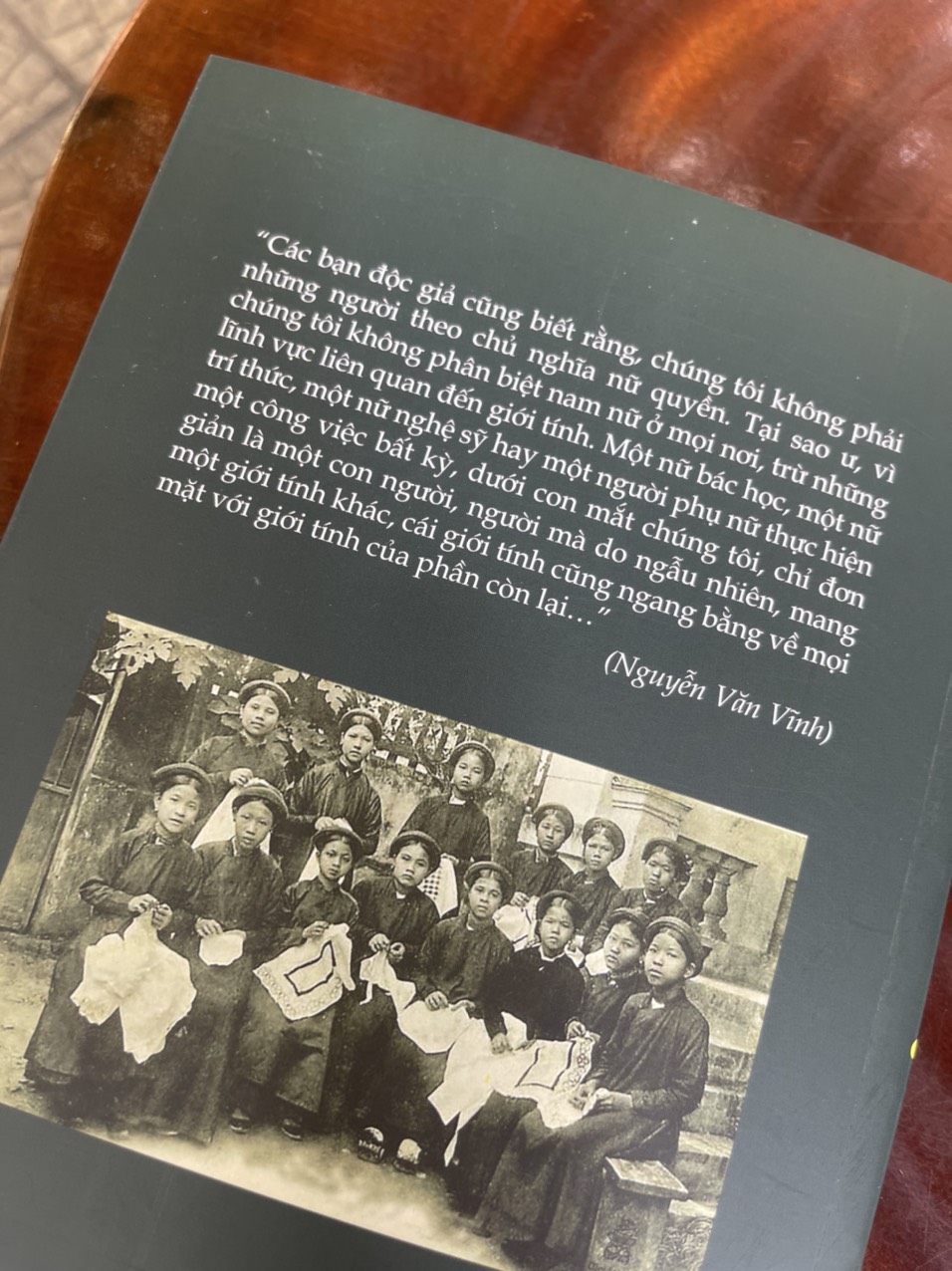 “Các bạn độc giả cũng biết rằng, chúng tôi không phải những người theo chủ nghĩa nữ quyền. Tại sao ư, vì chúng tôi không phân biệt nam nữ ở mọi nơi, trừ những lĩnh vực liên quan đến giới tính. Một nữ bác học, một nữ tri thức, một nữ nghệ sỹ hay một người phụ nữ thực hiện một công việc bất kỳ, dưới con mắt chúng tôi, chỉ đơn giản là một con người, người mà do ngẫu nhiên, mang một giới tính khác, cái giới tính cũng ngang bằng về mọi mặt với giới tính của phần còn lại…”