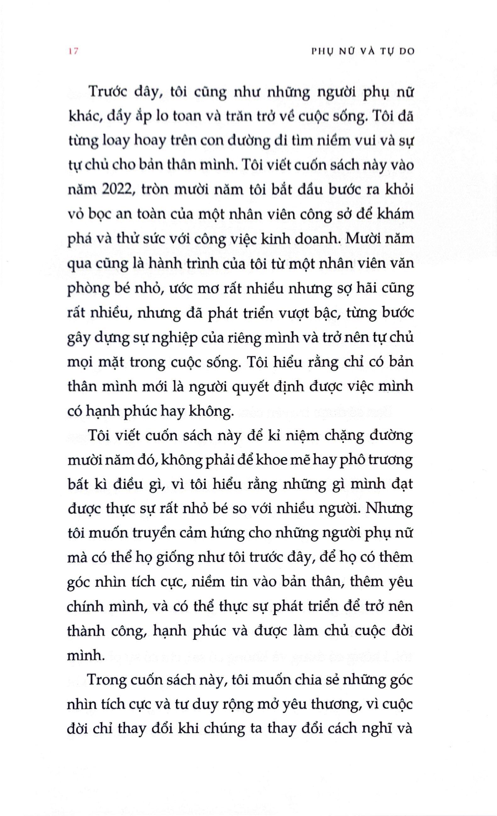 Bạn có thể bắt gặp những lời khuyên của tác giả trên sách báo, nhưng ở đây, chúng bắt nguồn từ những trải nghiệm thật của chính tác giả, mang một nguồn năng lượng dồi dào, rất có giá trị đối với sự phát triển bản thân của người phụ nữ. Dù ở độ tuổi nào, nếu được trang bị những kiến thức tuyệt vời như tác giả chia sẻ, thì chắc chắn bạn cũng có thể đạt được sự tự do trong cuộc sống.