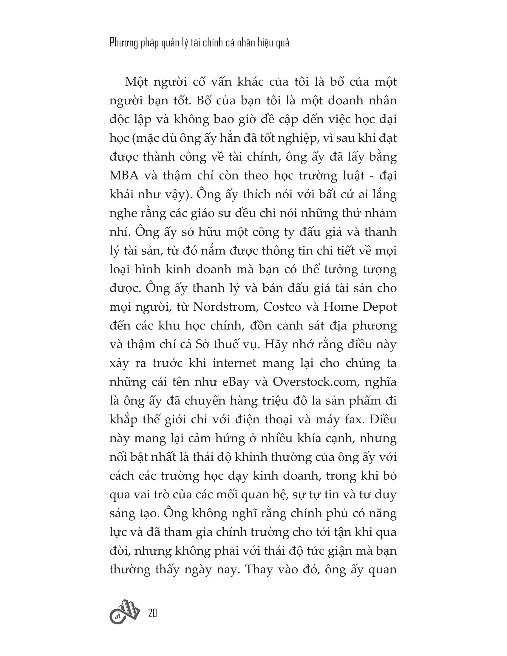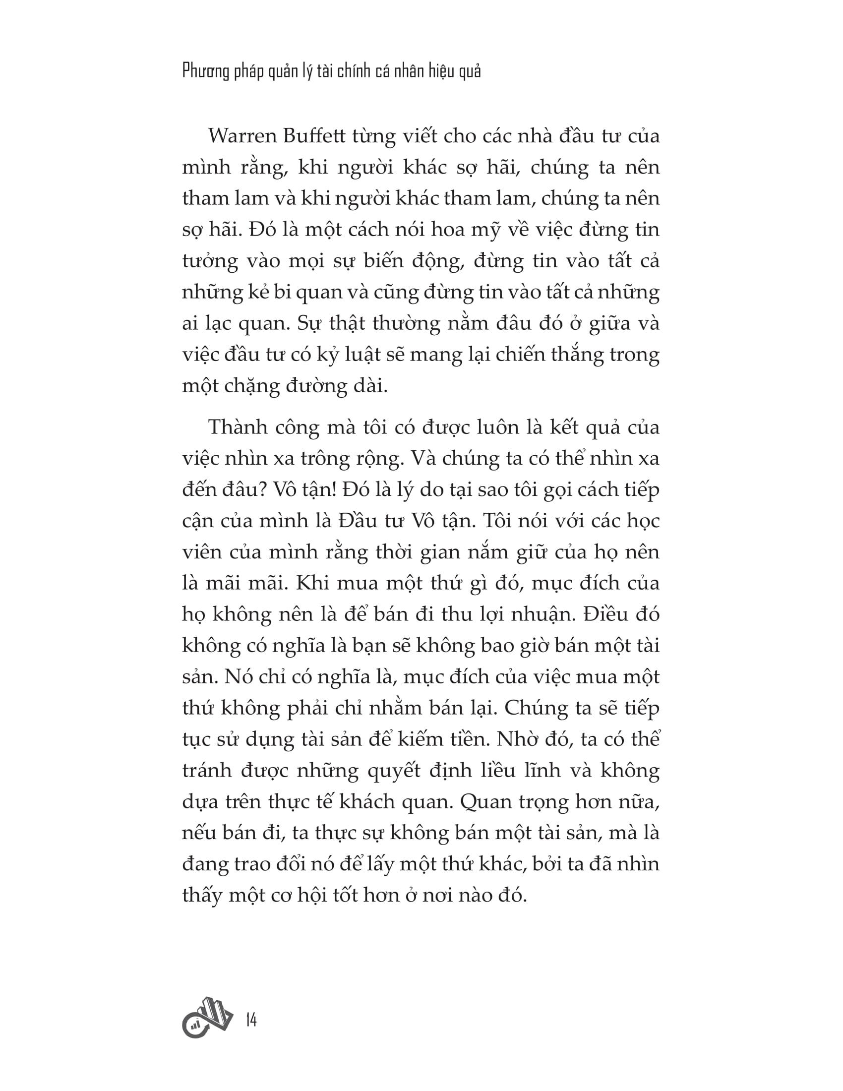 “Phương pháp quản lý tài chính cá nhân hiệu quả” cuốn sách viết về mọi thứ bạn có thể làm để tăng khả năng đạt đến “trạng thái vô tận” - một vị thế tài chính trong tương lai, khi bạn không còn phải làm việc trừ khi bạn muốn. Đồng thời còn giúp bạn thiết lập tư duy đúng đắn và đưa ra những lựa chọn tốt nhất có thể để quản lý tiền bạc thông minh, xoay quanh các nguyên tắc chi tiêu sáng suốt, tiết kiệm một cách kỷ luật và đầu tư an toàn. Đây là cơ sở để bất kỳ ai cũng có thể tích lũy sự giàu có và hướng tới sự độc lập về tài chính vững bền. Chiến lược trong “Phương pháp quản lý tài chính cá nhân hiệu quả” thực tế, phù hợp với tất cả mọi người, dễ hiểu và hoàn toàn khả thi.