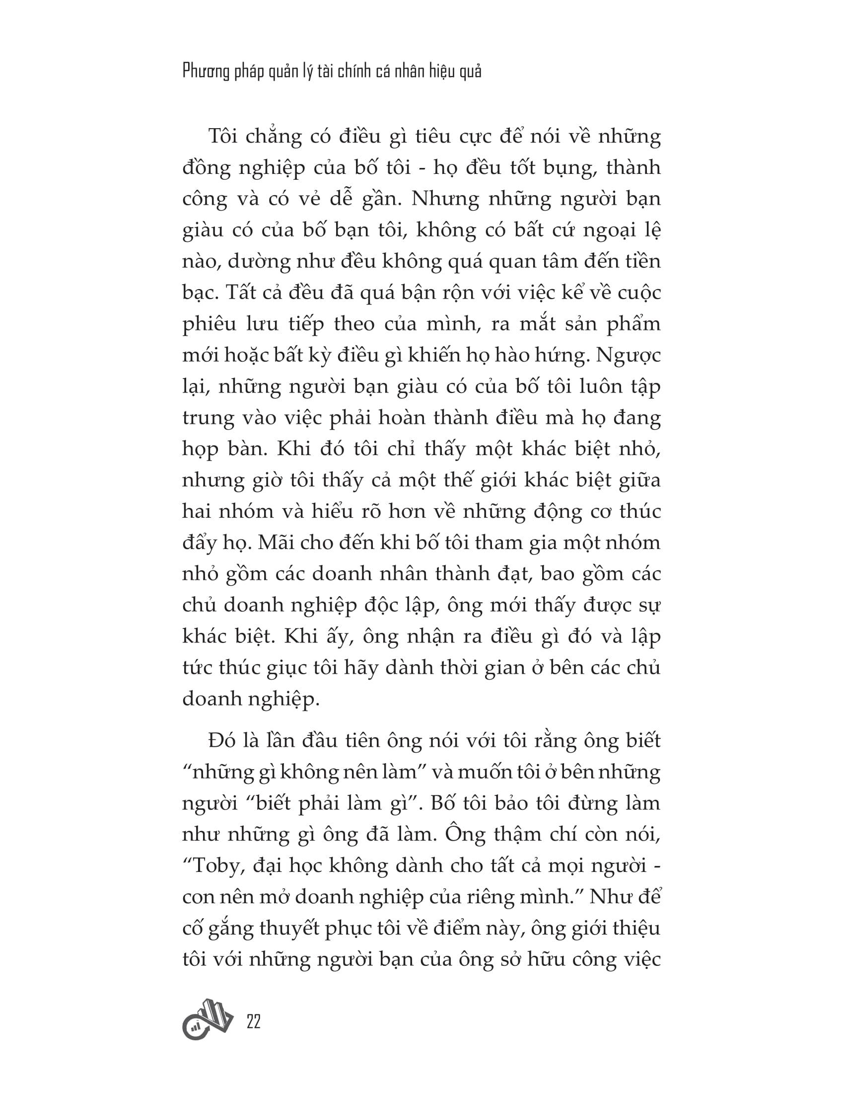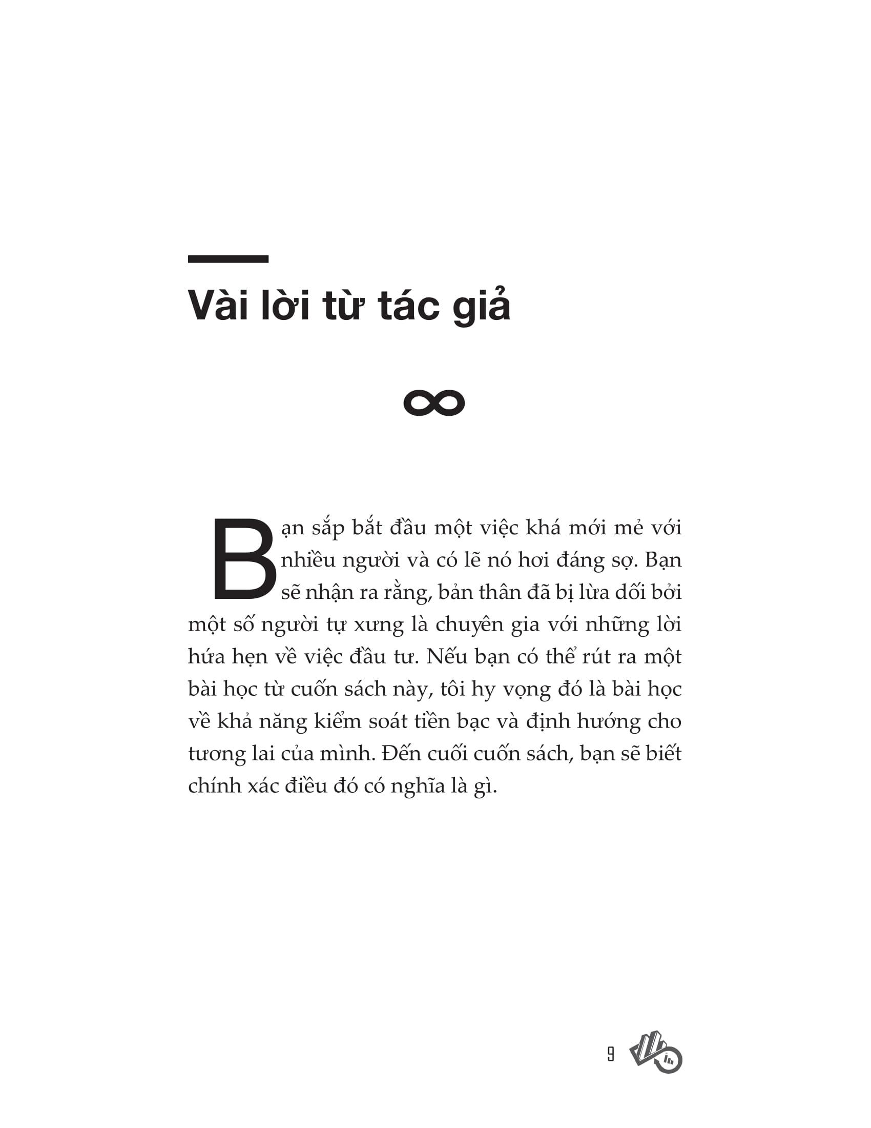 Các chương trong cuốn sách này được sắp xếp để bạn có một hướng tiếp cận rành mạch. Chương 1 giúp bạn hiểu tự do tài chính có ý nghĩa như thế nào. Chương 2 mô tả những điều sẽ xảy ra khi con người bị phụ thuộc về mặt tài chính, cụ thể là cảm giác bất lực không lối thoát dù bạn đã nỗ lực làm việc không ngưng nghỉ. Thực tế là, rất nhiều tổ chức tài chính đang hạn chế quyền tự do của bạn và tận dụng tiền của bạn cho lợi ích của họ. Trong Chương 3, chúng ta sẽ xem xét sự khác biệt hàng đầu giữa người giàu và người nghèo, qua đó xác định tư duy đúng đắn cần theo đuổi để trở nên độc lập về tài chính.