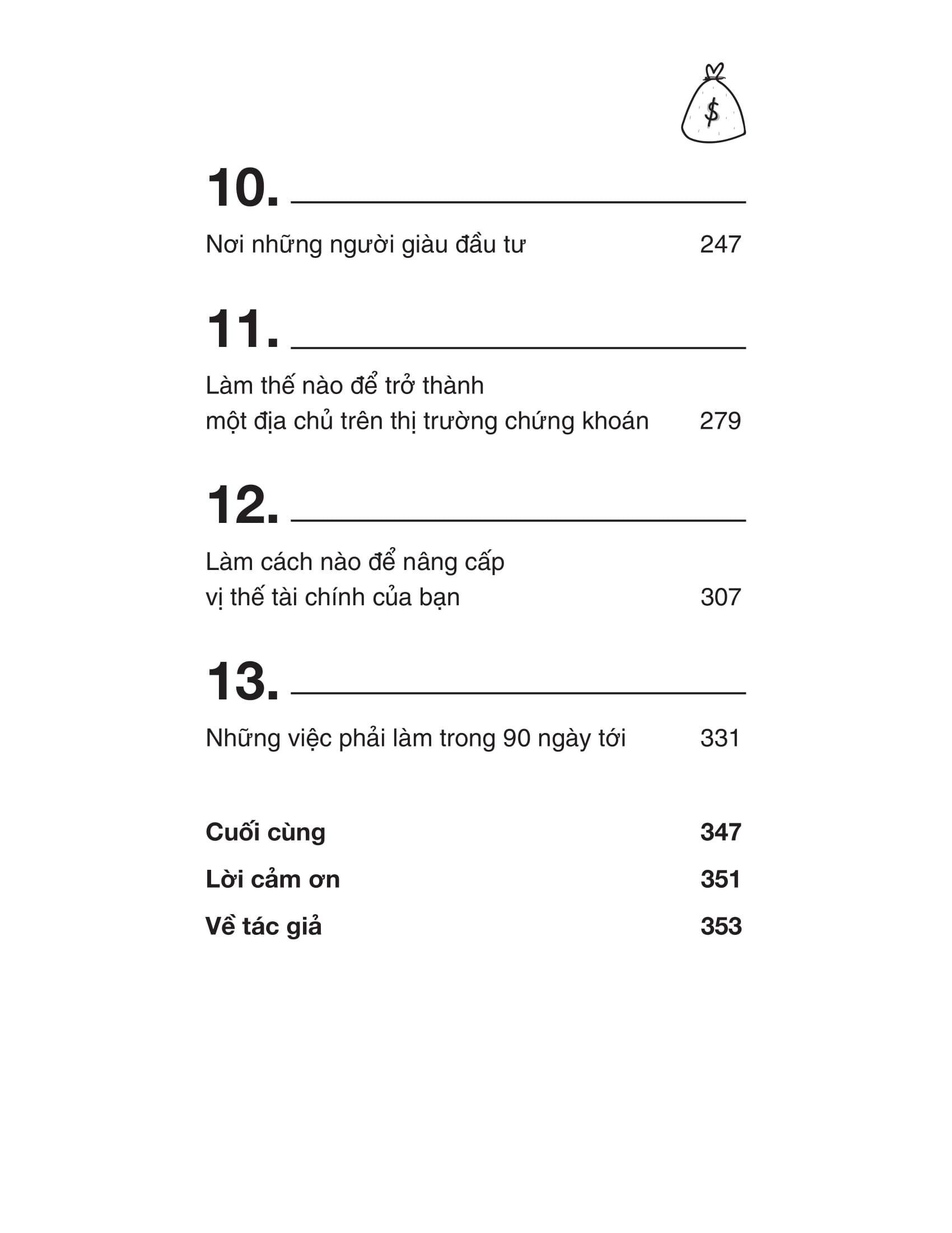 Trong Chương 9, bạn sẽ tìm hiểu những cấp độ tài chính từ thấp đến cao và xác định xem bạn hiện đang ở cấp độ nào. Chương 10 mô tả những gì chúng ta biết về cách những người giàu có đầu tư. Nghiên cứu cho thấy rằng, nếu bạn tuân theo các mô hình đầu tư của nhóm đó, rất có thể bạn cũng sẽ trở nên giàu có. Bạn sẽ học được một chiến lược đầu tư độc đáo trong Chương 11; sau đó, bạn sẽ học được cách nâng cao vị thế tài chính trong Chương 12.