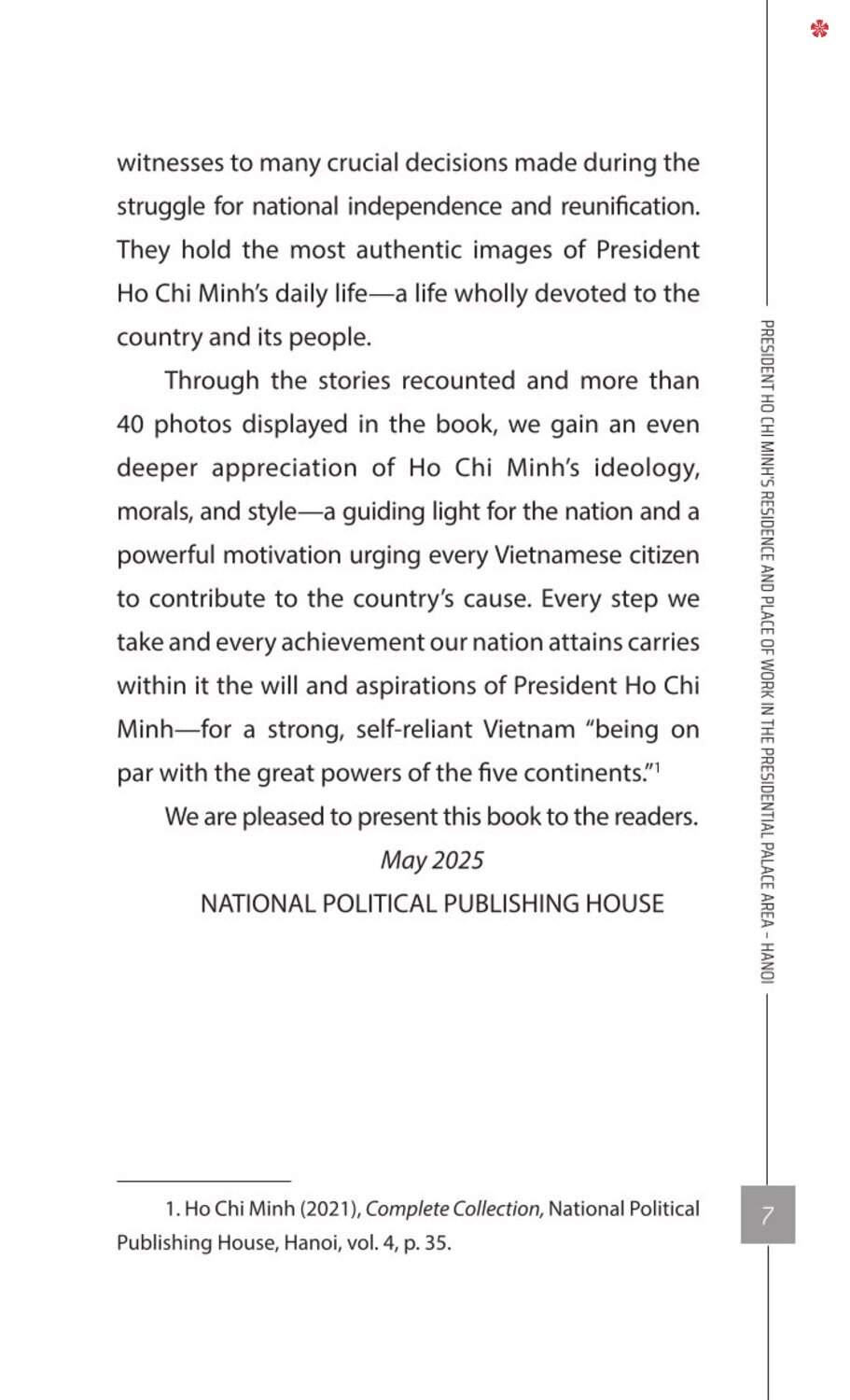 Mua tại TiktokThe book President Ho Chi Minh’s Residence and Place of Work in the Presidential Palace Area - Hanoi offers readers a valuable source of documents, helping each of us gain a deeper understanding of the life of the Vietnamese people’s beloved leader. The book vividly recreates and brings readers to every corner, every keepsake, and every simple yet profoundly meaningful story associated with President Ho Chi Minh in the Presidential Palace area—such as House 54, the Stilt House, House 67, the Fishpond, the Mango Path, and the Garden, among others.